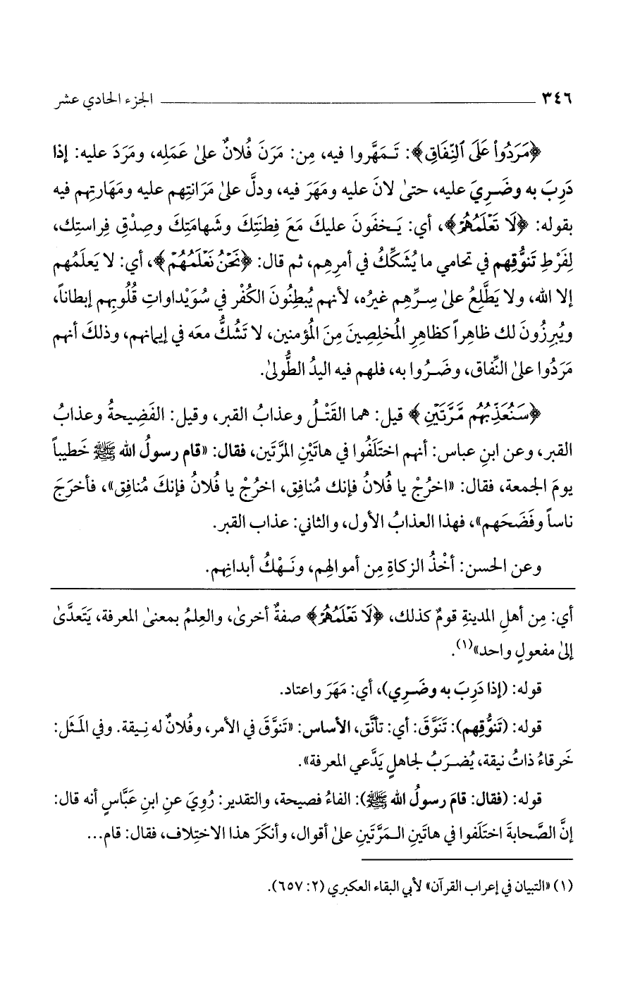 (سَنُعَذِّبُهُمْ مَرَّتَيْنِ) قيل: هما القتل وعذاب القبر، وقيل: الفضيحة وعذاب القبر، وعن ابن عباس: أنهم اختلفوا في هاتين المرّتين، فقال: "قام رسول الله صلى الله عليه وسلم خطيبا يوم الجمعة فقال: "اخرج يا فلان فإنك منافق، اخرج يا فلان فإنك منافق"، فأخرج ناسا وفضحهم"، فهذا العذاب الأوّل، والثاني عذاب القبر.
