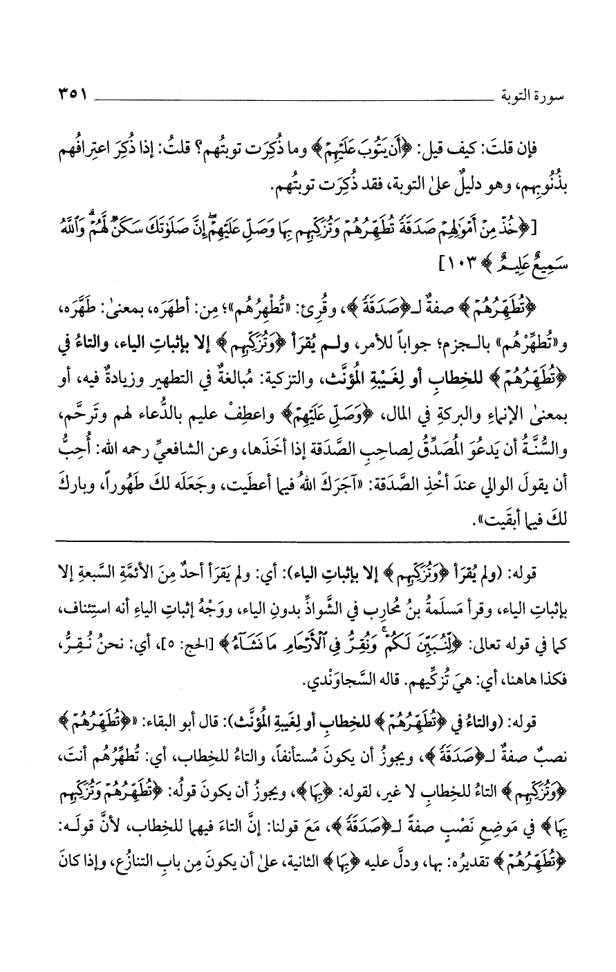 (تُطَهِّرُهُمْ) صفة لـ (صدقة)، وقرئ: "تطهرهم"، من أطهره، بمعنى: طهره. و"تطهرهم"، بالجزم جوابا للأمر. ولم يقرأ "وَتُزَكِّيهِمْ" إلا بإثبات الياء. والتاء في "تُطَهِّرُهُمْ" للخطاب أو لغيبة المؤنث، والتزكية: مبالغة في التطهير وزيادة فيه، أو بمعنى الإنماء والبركة في المال، (وَصَلِّ عَلَيْهِمْ) واعطف عليم بالدعاء لهم وترحم، والسنة أن يدعو المصدّق لصاحب الصدقة إذا أخذها، وعن الشافعي رحمه الله: أحب أن يقول الوالي عند أخذ الصدقة: "أجرك الله فيما أعطيت، وجعله لك طهوراً، وبارك لك فيما أبقيت".