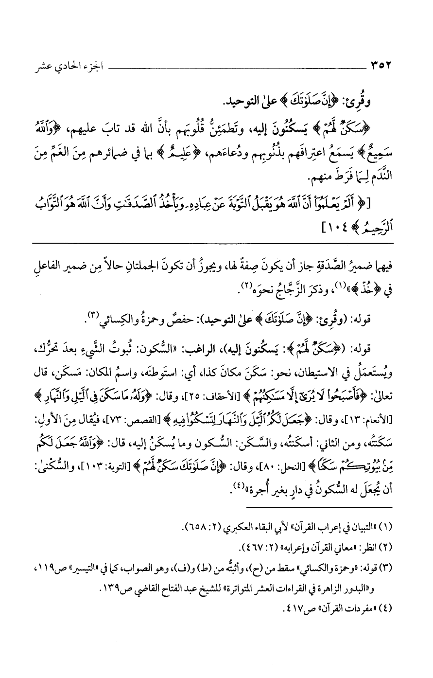 قوله: (وقرئ: (إِنَّ صَلاتَكَ) على التوحيد): حفص وحمزة والكسائي.