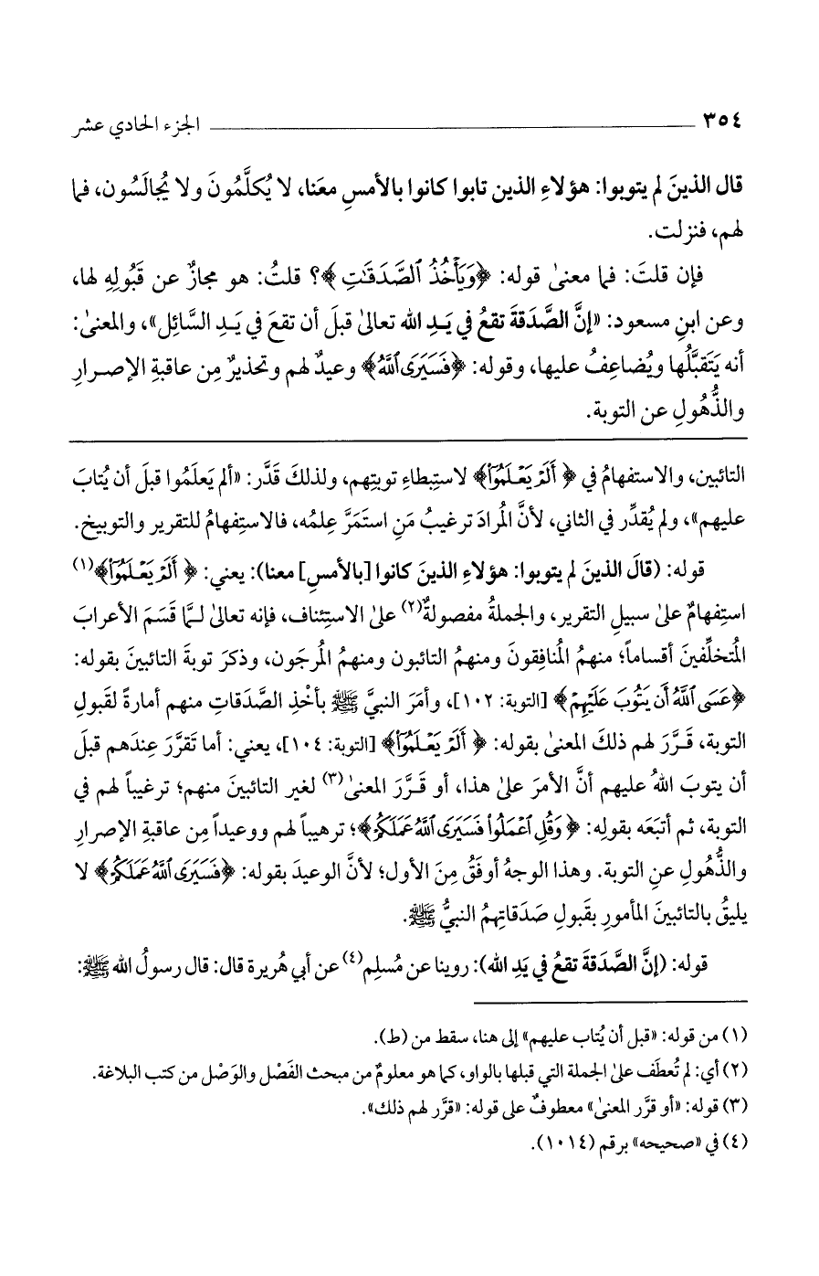 فإن قلت: فما معنى قوله: (وَيَاخُذُ الصَّدَقاتِ)؟ قلت: هو مجاز عن قبوله لها، وعن ابن مسعود "إن الصدقة تقع في يد الله تعالى قبل أن تقع في يد السائل"، والمعنى: أنه يتقبلها ويضاعف عليها، وقوله (فَسَيَرَى اللَّهُ) وعيد لهم وتحذير من عاقبة الإصرار والذهول عن التوبة.