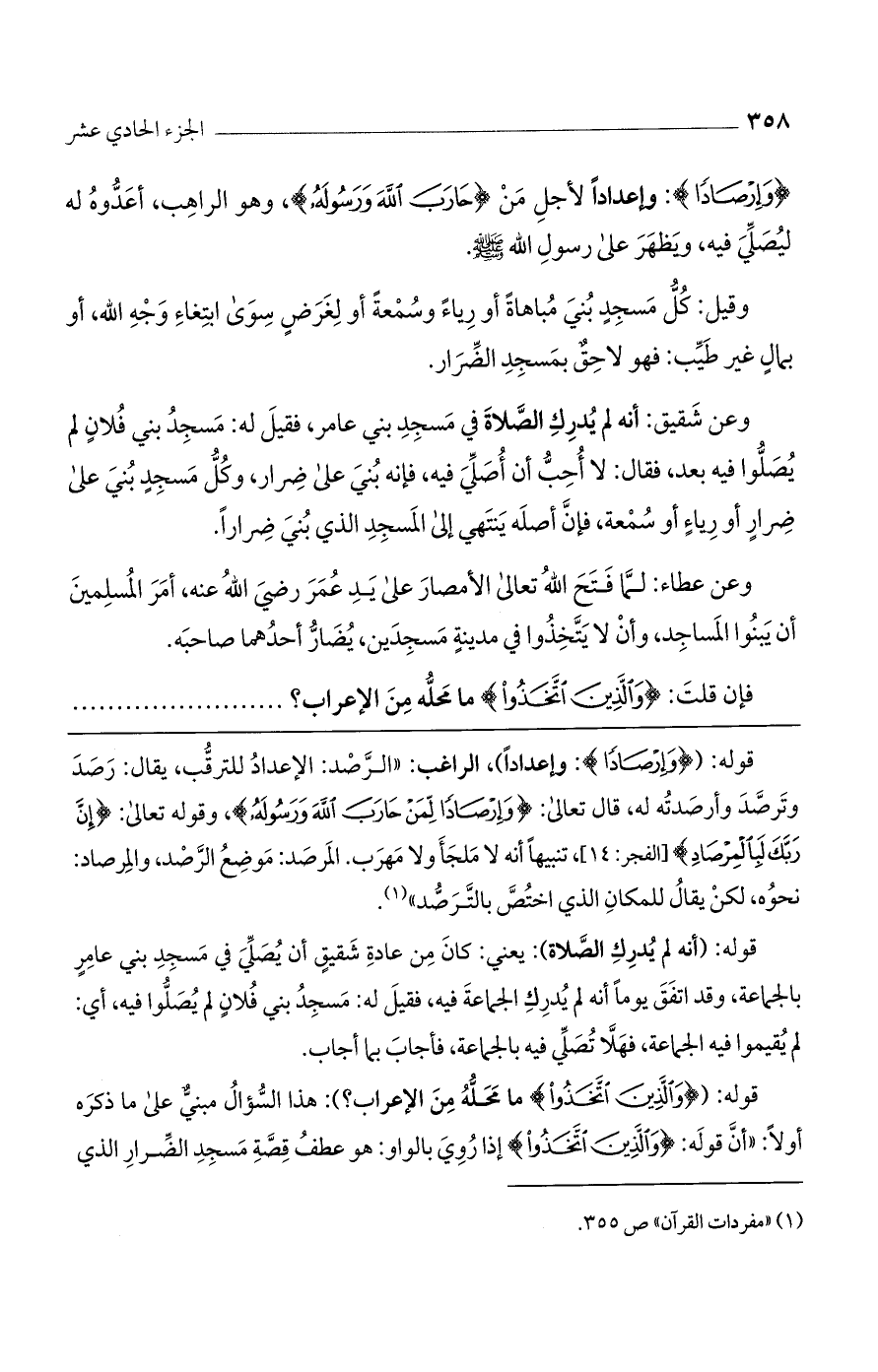 (وَإِرْصاداً): وإعداداً لأجل لمَنْ (حارَبَ اللَّهَ وَرَسُولَهُ)، وهو الراهب، أعدوه له ليصلى فيه، ويظهر على رسول الله صلى الله عليه وسلم.