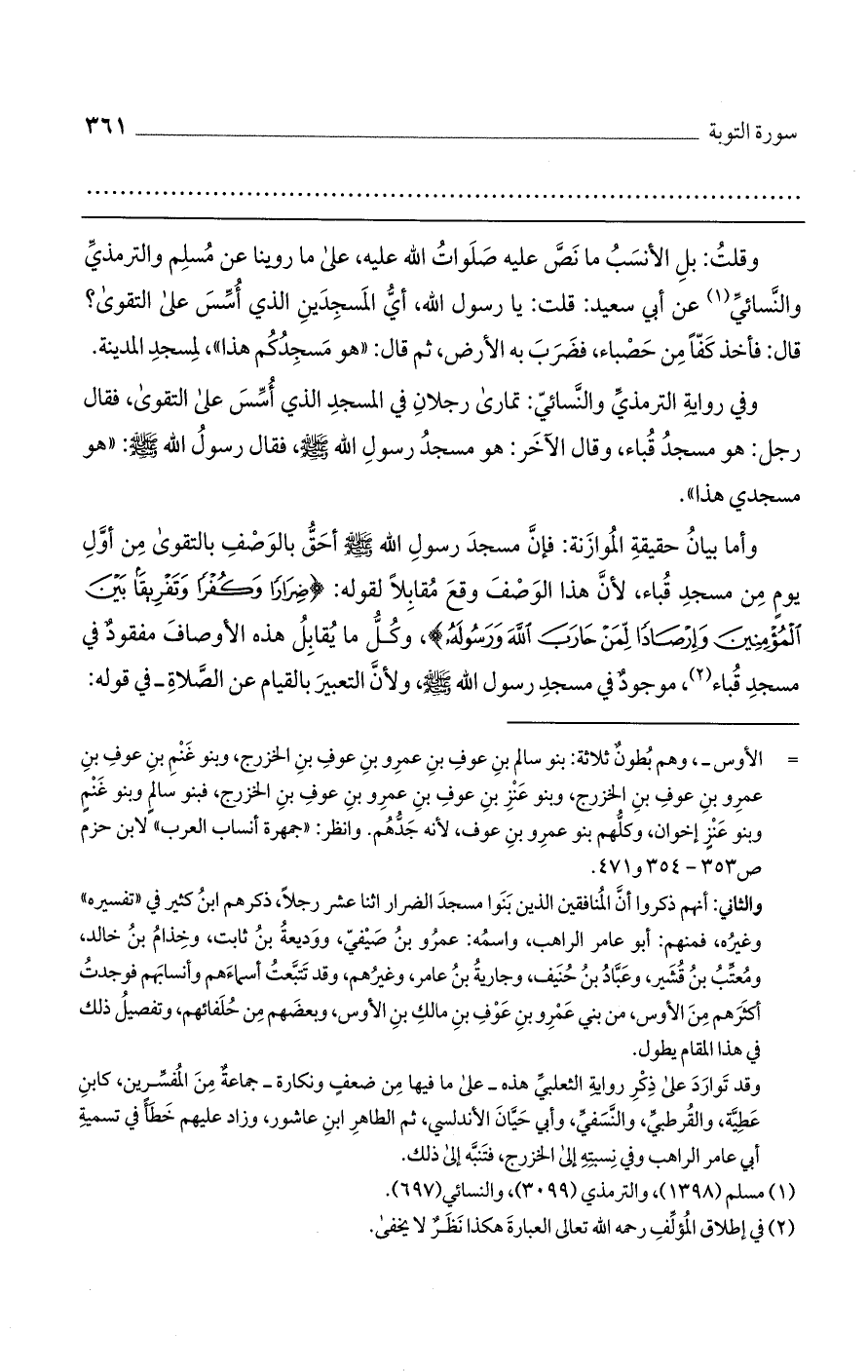 وقلت: بل الأنسب ما نص عليه صلوات الله عليه، على ما روينا عن مسلم والترمذي والنسائي عن أبي سعيد: قلت: يا رسول الله، أي المسجدين الذي أسس على التقوى؟ قال: فأخذ كفاً من حصباء، فضرب به الأرض، ثم قال: "هو مسجدكم هذا"، لمسجد المدينة.