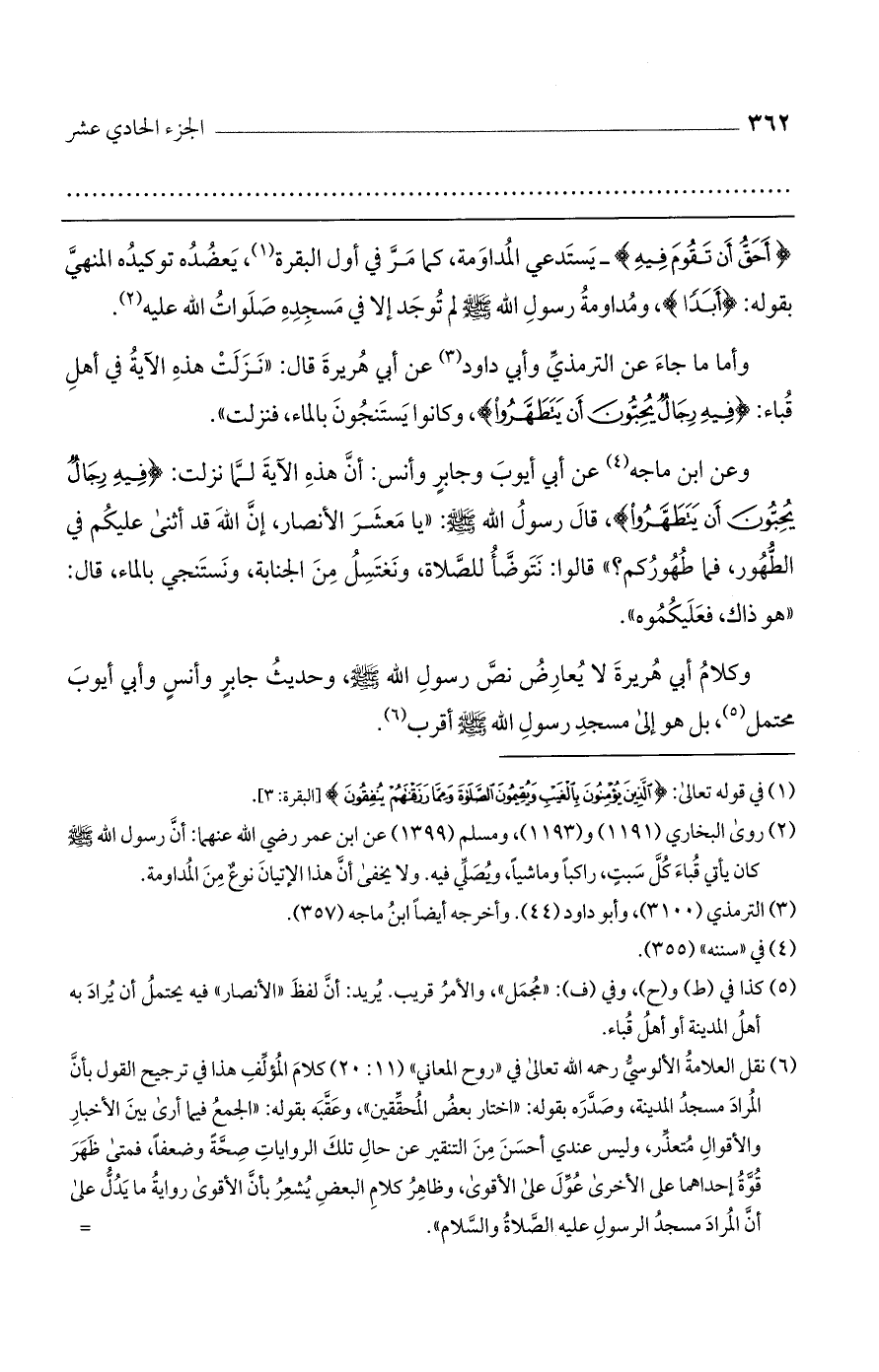 وأما ما جاء عن الترمذي وأبي داود عن أبي هريرة قال: "نزلت هذه الآية في أهل قُباء: (فِيهِ رِجَالٌ يُحِبُّونَ أَنْ يَتَطَهَّرُوا)، وكانوا يستنجون بالماء، فنزلت".
