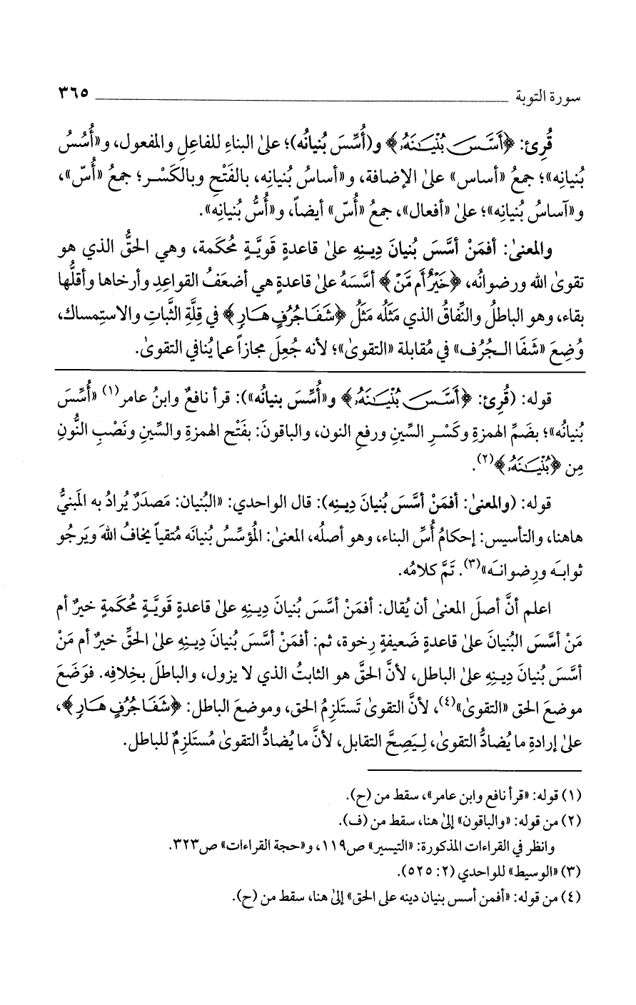قوله: (قرئ: (أَسَّسَ بُنْيَانَهُ) و"أسس بنيانه"): قرأ نافع وابن عامر "أسس بنيانه"؛ بضم الهمزة وكسر السين ورفع النون، والباقون: بفتح الهمزة واسين ونصب النون من (بُنْيَانَهُ).