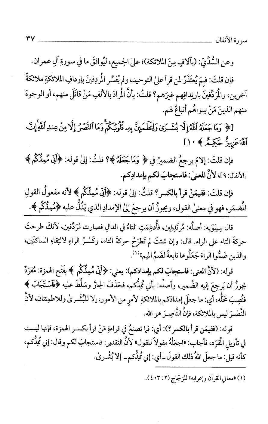 قوله: (لأن المعنى: فاستجاب لكم بإمدادكم): يعني: (أَنِّي مُمِدُّكُمْ) بفتح الهمزة: مفرد يجوز أن يرجع إليه الضمير، وأصله: بأني ممدكم، فحذف الجار وسلط عليه (فَاسْتَجَابَ) فنصب محله، أي: ما جعل إمدادكم بالملائكة لأمر من الأمور، إلا للبشرى وللاطمئنان، لأن النصر ليس بالملائكة، فإن الناصر هو الله.
