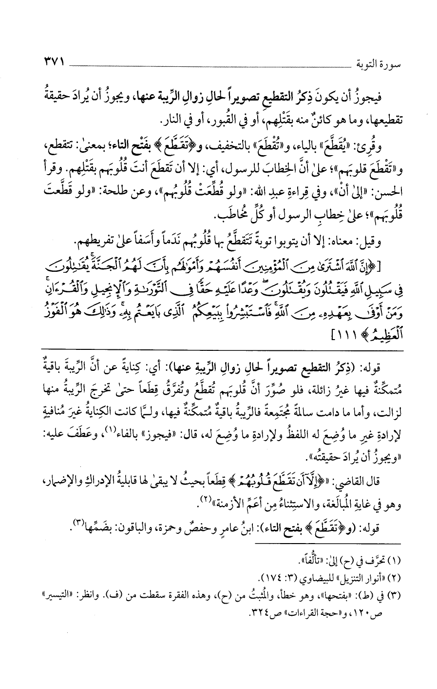 "إلى أن"، وفي قراءة عبد الله: "ولو قطعت قلوبهم"، وعن طلحة: "ولو قطعت قلوبهم"؛ على خطاب الرسول أو كل مخاطب.