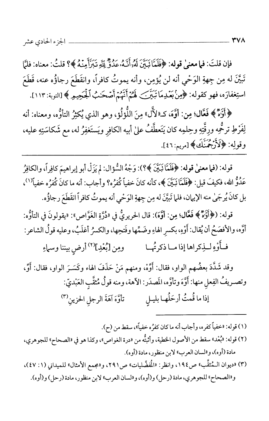 (أَوَّاهٌ) فعال، من أوه كـ"لال" من اللؤلؤ، وهو الذي يكثر التأوه، ومعناه: أنه لفرط ترحمه ورقته وحلمه كان يتعطف على أبيه الكافر ويستغفر له، مع شكاسته عليه، وقوله (لأرجمنك) [مريم: 46].