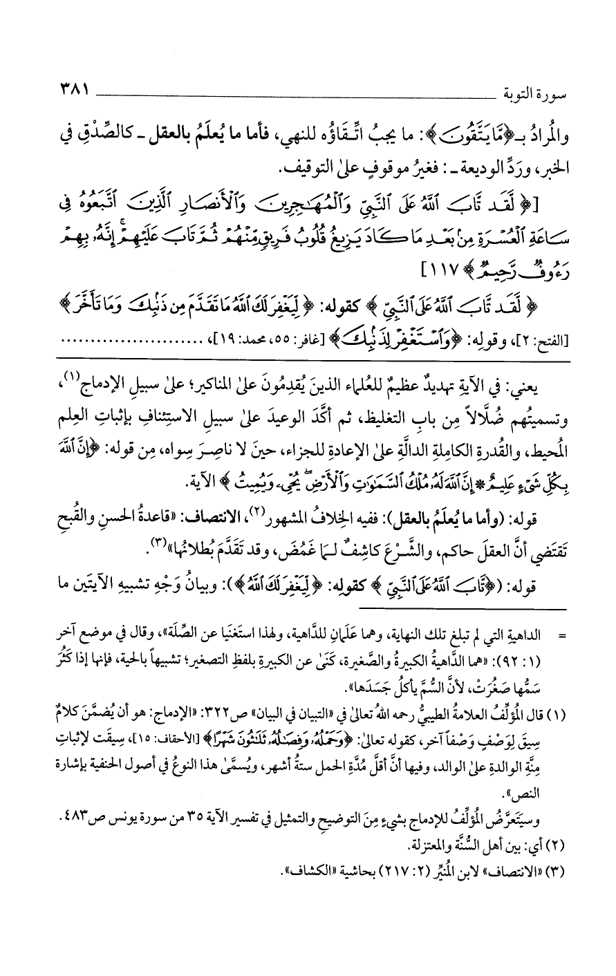 (لقد تابَ اللَّهُ عَلَى النَّبِيِّ) كقوله: (لِيَغْفِرَ لَكَ اللَّهُ ما تَقَدَّمَ مِنْ ذَنْبِكَ وَما تَأَخَّرَ) [الفتح: 2]، وقوله: (وَاسْتَغْفِرْ لِذَنْبِكَ) [غافر: 55، محمد: 19]،
