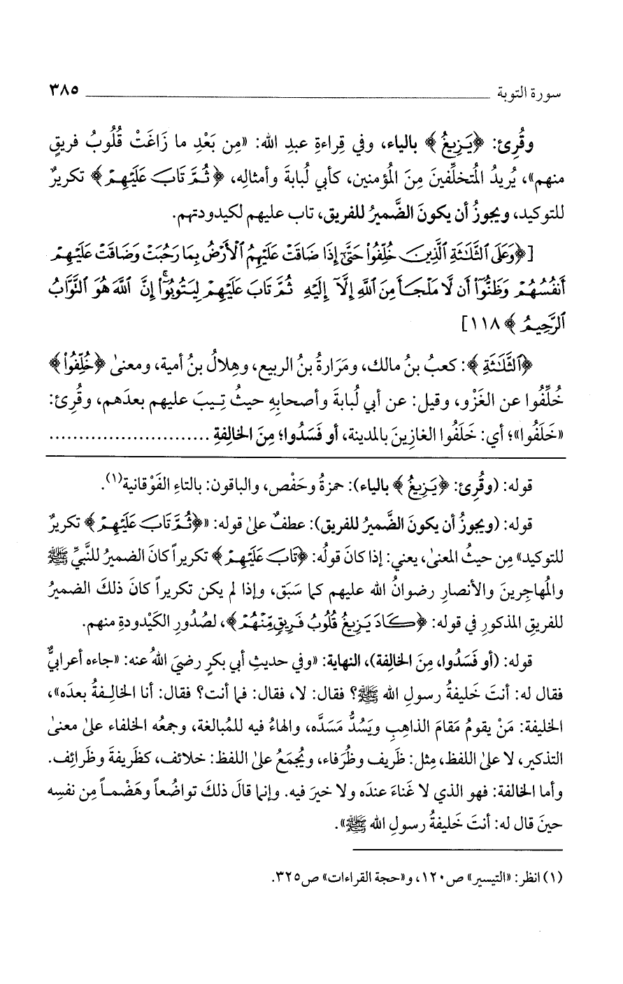 قوله: (ويجوز أن يكون الضمير للفريق): عطف على قوله: (ثُمَّ تَابَ عَلَيْهِمْ) تكرير للتوكيد" من حيث المعنى، يعني: إذا كان قوله: (تَابَ عَلَيْهِمْ) تكريراً كان الضمير للنبي صلى الله عليه وسلم والمهاجرين والأنصار رضوان الله عليهم كما سبق، وإذا لم يكن تكريراً كان ذلك الضمير للفريق المذكور في قوله: (كَادَ يَزِيغُ قُلُوبُ فَرِيقٍ مِنْهُمْ)، لصدور الكيدودة منهم.