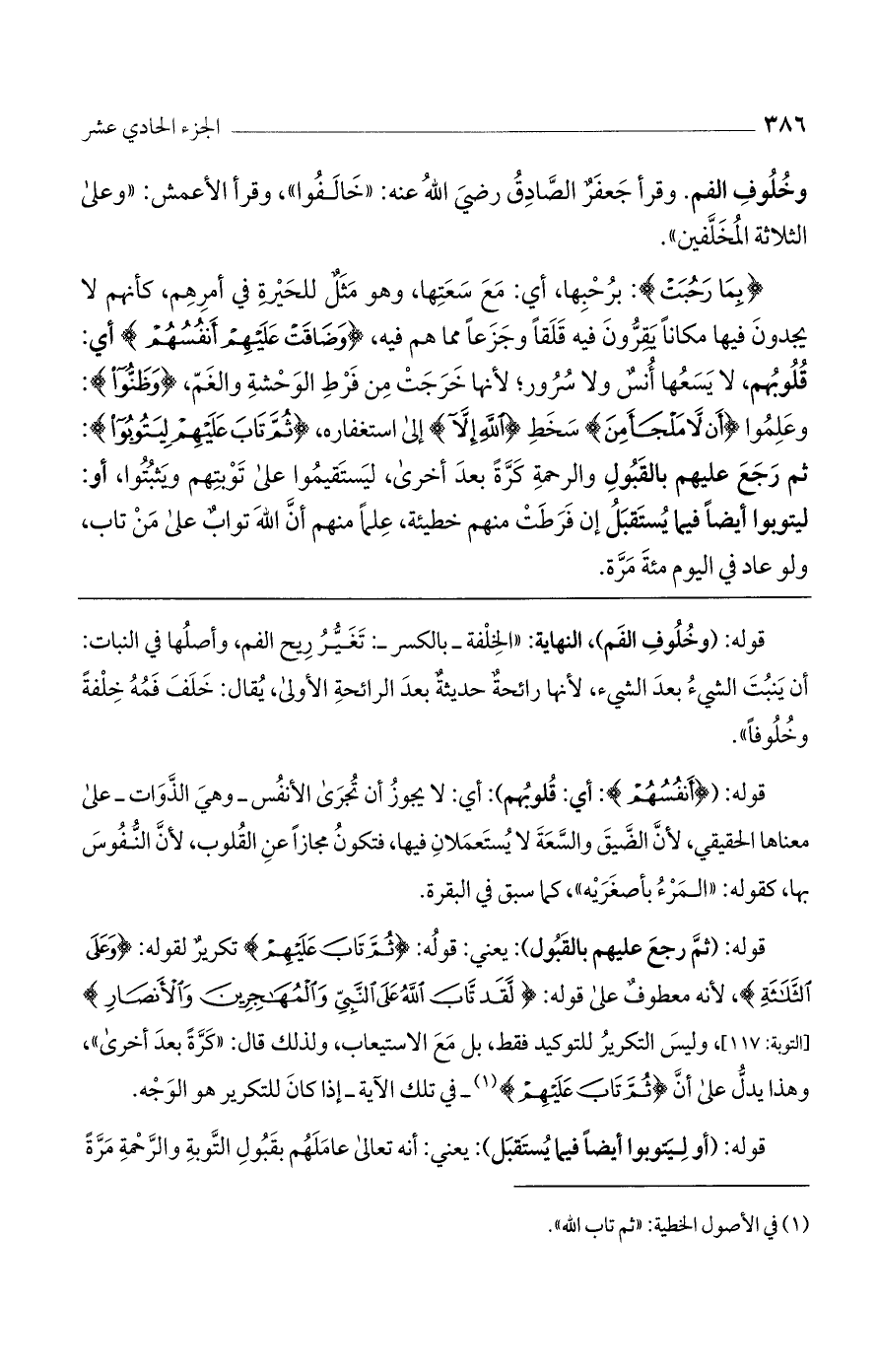 قوله: (ثم رجع عليهم بالقبول): يعني: قوله: (ثُمَّ تَابَ عَلَيْهِمْ) تكرير لقوله: (وَعَلَى الثَّلاثَةِ)، لأنه معطوف على قوله: (لَقَدْ تَابَ اللَّهُ عَلَى النَّبِيِّ وَالْمُهَاجِرِينَ وَالأَنصَارِ) [التوبة: 117]، وليس التكرير للتوكيد فقط، بل مع الاستيعاب، ولذلك قال: "كرة بعد أخرى"، وهذا يدل على أن (ثُمَّ تَابَ عَلَيْهِمْ) - في تلك الآية- إذا كان للتكرير هو الوجه.