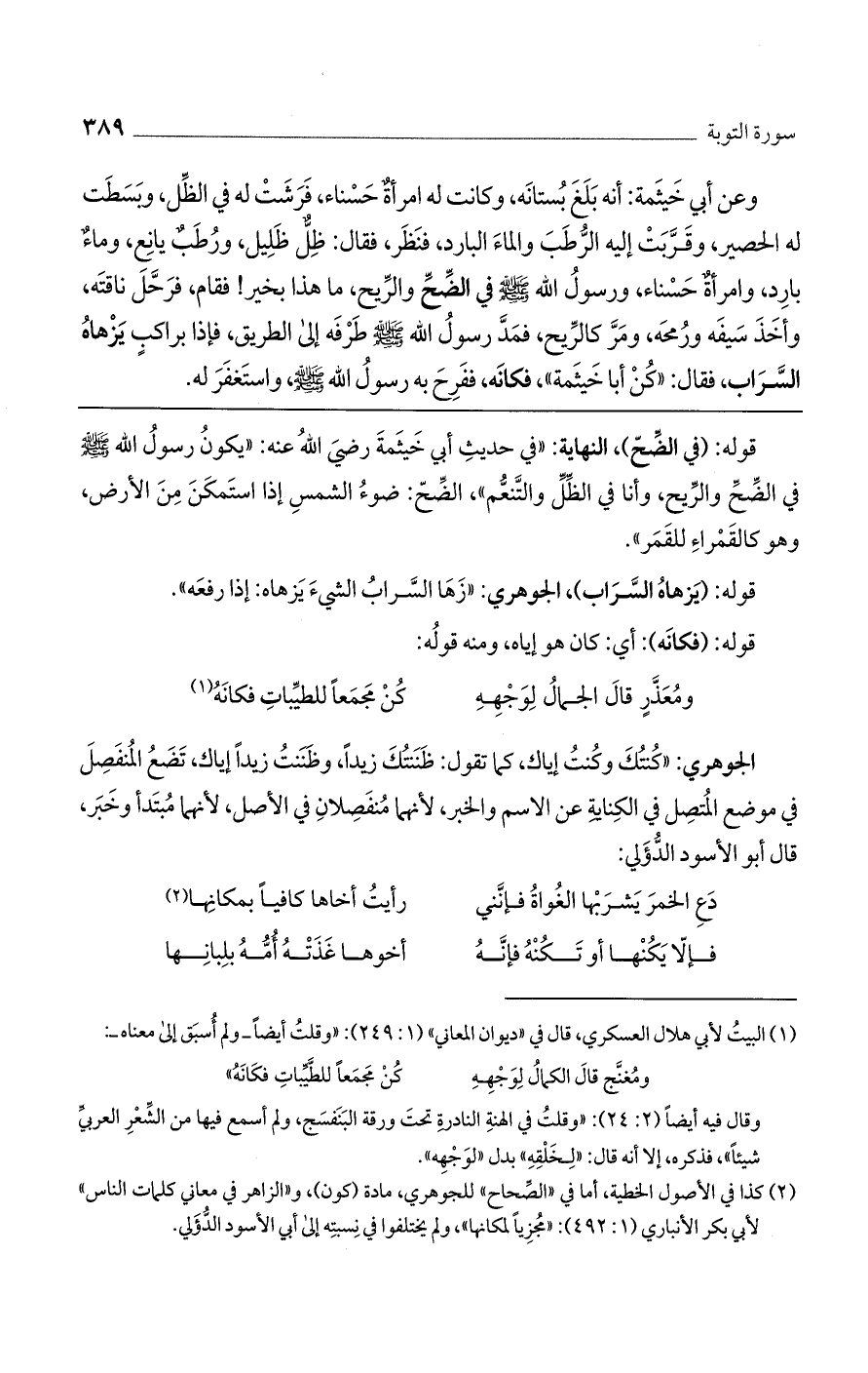 وعن أبي خيثمة، أنه بلغ بستانه، وكانت له امرأة حسناء، فرشت له في الظل، وبسطت له الحصير، وقربت إليه الرطب والماء البارد، فنظر، فقال: ظل ظليل، ورطب يانع، وماء بارد، وامرأة حسناء، ورسول الله صلى الله عليه وسلم في الضحّ والريح، ما هذا بخير، فقام فرحل ناقته، وأخذ سيفه ورمحه، ومرّ كالريح، فمدّ رسول الله صلى الله عليه وسلم طرفه إلى الطريق، فإذا براكب يزهاه السراب، فقال: "كن أبا خثيمة"، فكأنه، ففرح به رسول الله صلى الله عليه وسلم، واستغفر له.