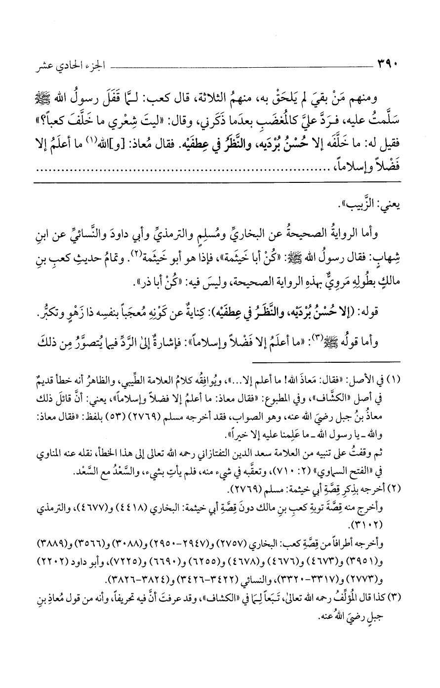 ومنهم من بقي لم يلحق به، منهم الثلاثة، قال كعب: لما قفل رسول الله صلى الله عليه وسلم سلمت عليه، فردّ علىّ كالمغضب بعدما ذكرني وقال: "ليت شعري ما خلف كعباً"؟ فقيل له: ما خلفه إلا حسن برديه، والنظر في عطفيه. فقال: معاذ "و" الله ما أعلم إلا فضلا وإسلاماً،