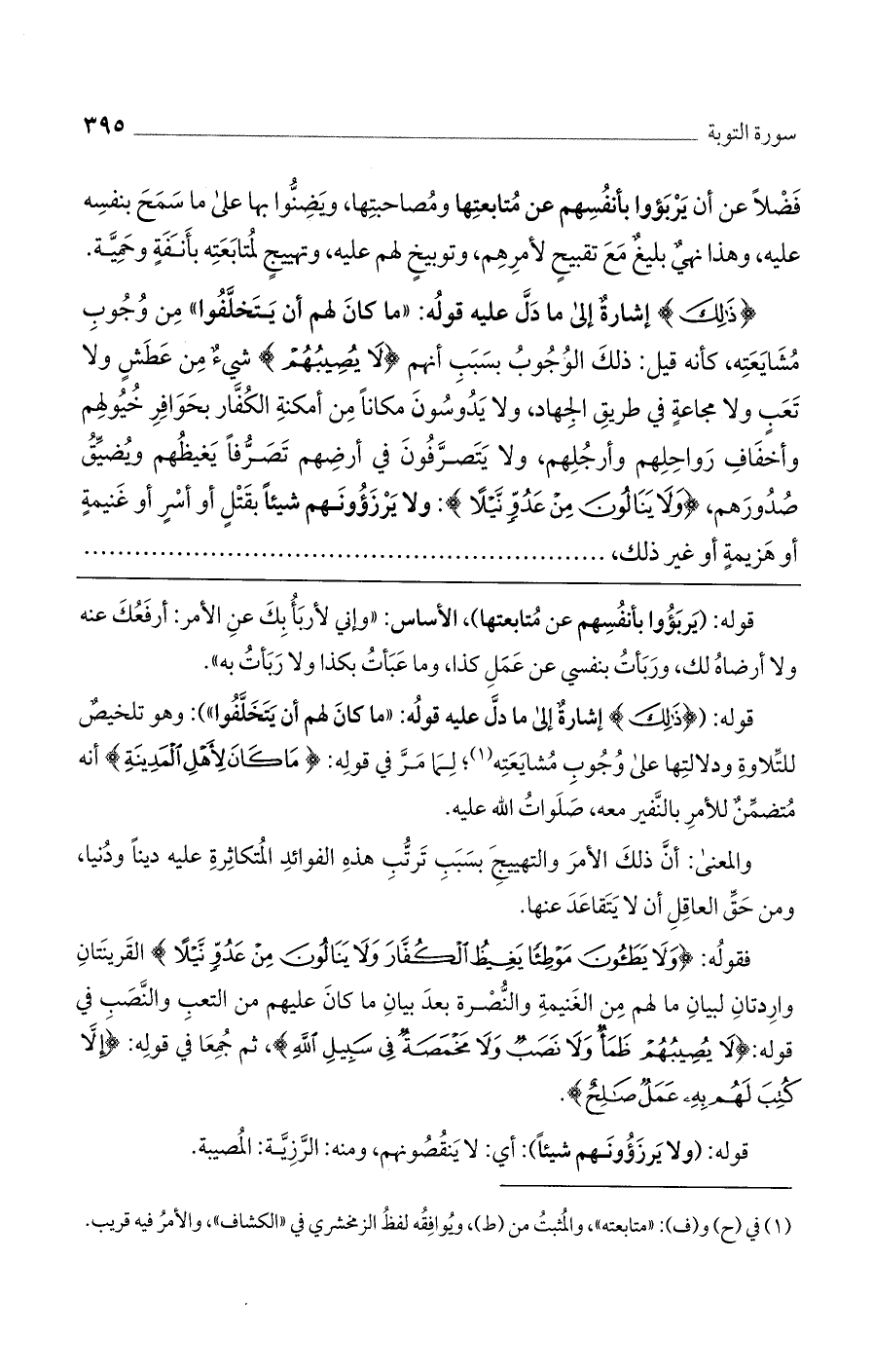 قوله: ((ذَلِكَ) إشارة إلى ما دل عليه قوله: "ما كان لهم أن يتخلفوا"): وهو تلخيص للتلاوة ودلالتها على وجوب مشايعته؛ لما مر في قوله: (مَا كَانَ لأَهْلِ الْمَدِينَةِ) أنه متضمن للأمر بالنفير معه، صلوات الله عليه.