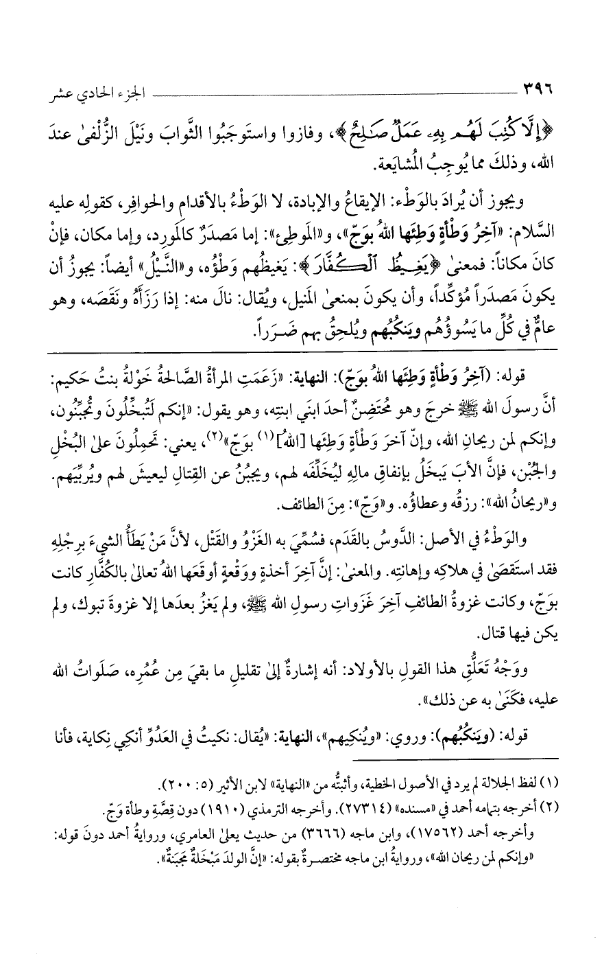 والوطء في الأصل: الدوس بالقدم، فسُمي به الغزو والقتل، لأن من يطأ الشيء برجله فقد استقصى في هلاكه وإهانته. والمعنى: إن آخر أخذة ووقعة أوقعها الله تعالى بالكفار كانت بوج، وكانت غزوة الطائف آخر غزوات رسول الله صلى الله عليه وسلم، ولم يغز بعدها إلا غزوة تبوك، ولم يكن فيها قتال.