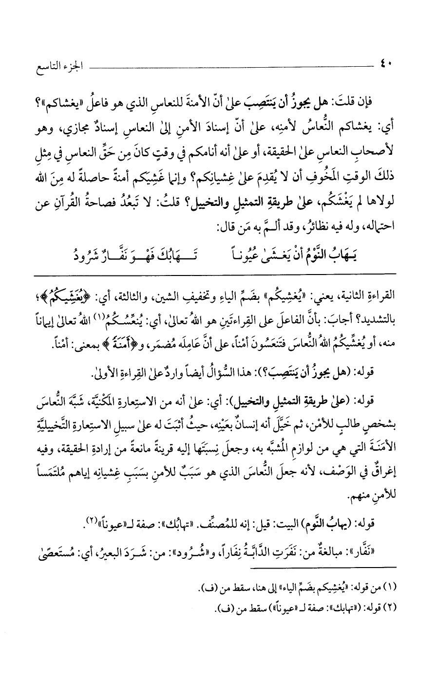 فإن قلت: هل يجوز أن ينتصب على أنّ الأمنة للنعاس الذي هو فاعل "يغشاكم"؟ أي: يغشاكم النعاس لأمنه، على أن إسناد الأمن إلى النعاس إسناد مجازى، وهو لأصحاب النعاس على الحقيقة، أو على أنه أنامكم في وقت كان من حق النعاس في مثل ذلك الوقت المخوف أن لا يقدم على غشيانكم؟ وإنما غشيكم أمنة حاصلة من الله لولاها لم يغشكم، على طريقة التمثيل والتخييل؟ قلت: لا تبعد فصاحة القرآن عن احتماله، وله فيه نظائر، وقد ألم به من قال: