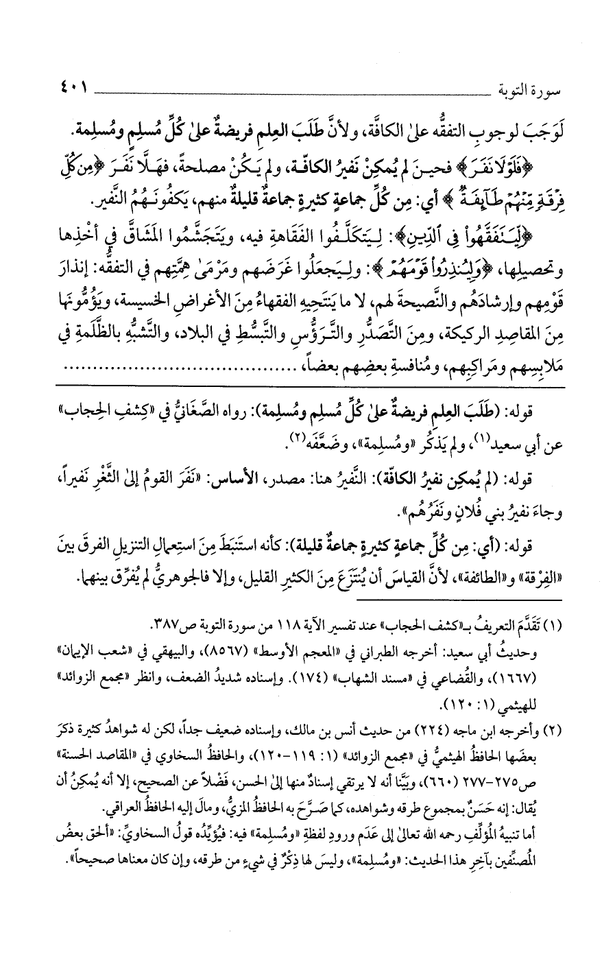 قوله: (طلب العلم فريضة على كل مسلم ومسلمة): رواه الصغاني في "كشف الحجاب" عن أبي سعيد، ولم يذكر "ومسلمة"، وضعفه.