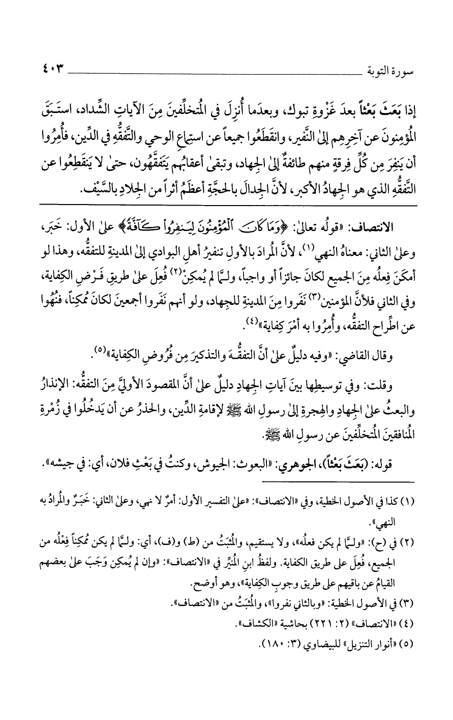 الانتصاف: "قوله تعالى: (وَمَا كَانَ الْمُؤْمِنُونَ لِيَنفِرُوا كَافَّةً) على الأول: خبر، وعلى الثاني: معناه النهي، لأن المراد بالأول تنفير أهل البوادي إلى المدينة للتفقه، وهذا لو أمكن فعله من الجميع لكان جائزاً أو واجباً، ولما لم يُمكن فُعل على طريق فرض الكفاية، وفي الثاني فلأن المؤمنين نفروا من المدينة للجهاد، ولو أنهم نفروا أجمعين لكان ممكناً، فنهوا عن اطراح التفقه، وأمروا به أمر كفاية".