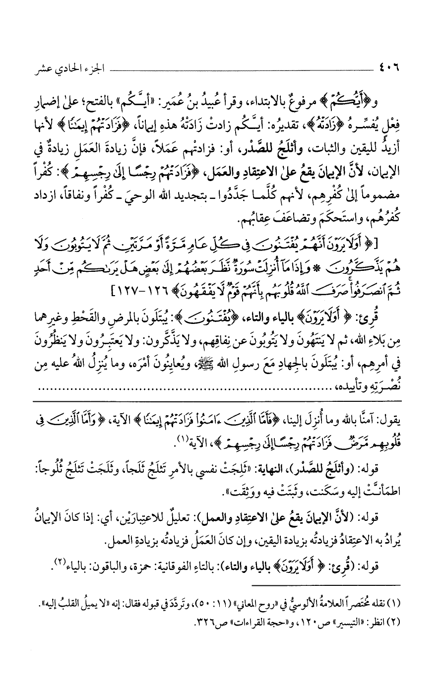 و (أيكم) مرفوع بالابتداء، وقرأ عبيد بن عمير: " أيكم" بالفتح؛ على إضمار فعل يفسره (زادَتْهُ)، تقديره: أيكم زادت زادته هذه إيمانا (فَزادَتْهُمْ إِيماناً) لأنها أزيد لليقين والثبات، وأثلج للصدر. أو فزادتهم عملا، فإن زيادة العمل زيادة في الإيمان، لأنّ الإيمان يقع على الاعتقاد والعمل، (فَزادَتْهُمْ رِجْساً إِلَى رِجْسِهِمْ): كفراً مضموما إلى كفرهم، لأنهم كلما جدّدوا -بتجديد الله الوحي- كفراً ونفاقا، ازداد كفرهم، واستحكم وتضاعف عقابهم.