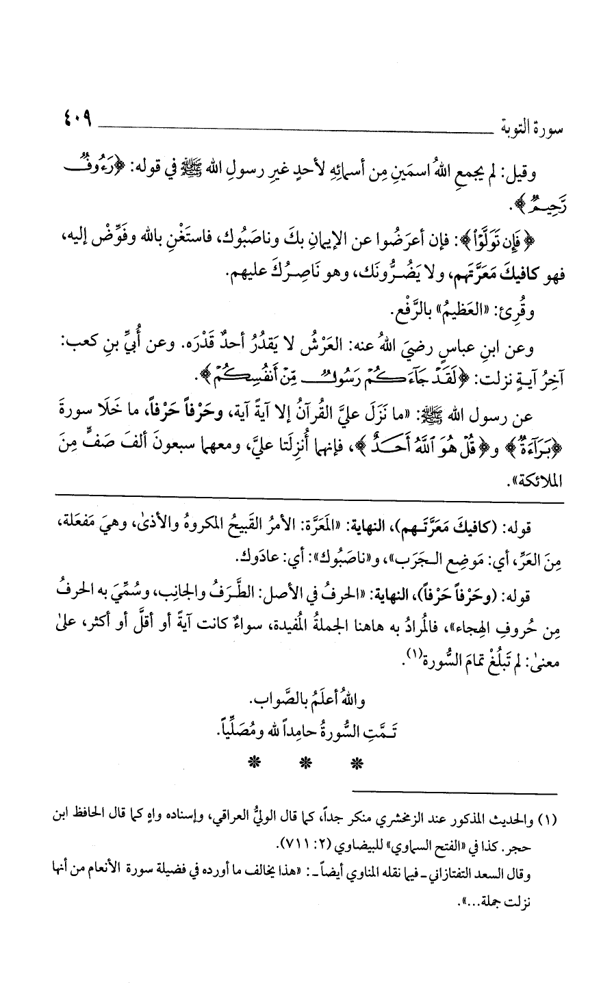 عن رسول الله صلى الله عليه وسلم "ما نزل علىّ القرآن إلا آية آية، وحرفاً حرفاً، ما خلا سورة (براءة) و (قل هو الله أحد)، فإنهما أنزلتا علىّ، ومعهما سبعون ألف صف من الملائكة".