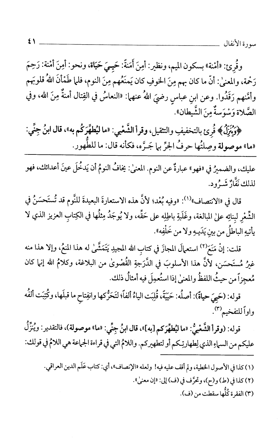 قوله: (وقرأ الشعبي: "ما ليطهركم [به] "، قال ابن جني: "ما"موصولة)، فالتقدير: وينزل عليكم من السماء الذي لطهارتكم أو لتطهيركم. واللام التي في قراءة الجماعة هي اللام في قولك: