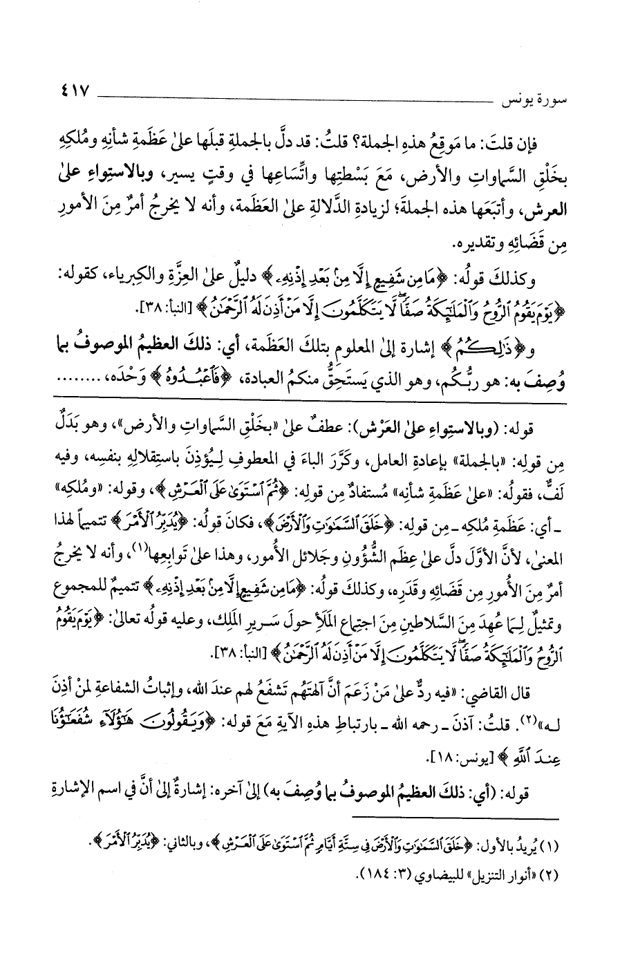 قوله: (وبالاستواء على العرش): عطف على "بخلق السماوات والأرض"، وهو بدل من قوله: "بالجملة" بإعادة العامل، وكرر الباء في المعطوف ليؤذن باستقلاله بنفسه، وفيه لف، فقوله: "على عظمة شأنه" مستفاد من قوله: (ثُمَّ اسْتَوَى عَلَى الْعَرْشِ)، وقوله: "ومُلكه" -أي: عظمة مُلكه-من قوله: (خَلَقَ السَّمَوَاتِ وَالأَرْضَ)، فكان قوله: (يُدَبِّرُ الأَمْرَ) تتميماً لهذا المعنى، لأن الأول دل على عظم الشؤون وجلائل الأمور، وهذا على توابعها، وأنه لا يخرج أمر من الأمور من قضائه وقدره، وكذلك قوله: (مَا مِنْ شَفِيعٍ إِلاَّ مِنْ بَعْدِ إِذْنِهِ) تتميم للمجموع وتمثيل لما عُهد من السلاطين من اجتماع الملأ حول سرير الملك، وعليه قوله تعالى: (يَوْمَ يَقُومُ الرُّوحُ وَالْمَلائِكَةُ صَفّاً لا يَتَكَلَّمُونَ إِلاَّ مَنْ أَذِنَ لَهُ الرَّحْمَنُ) [النبأ: 38].