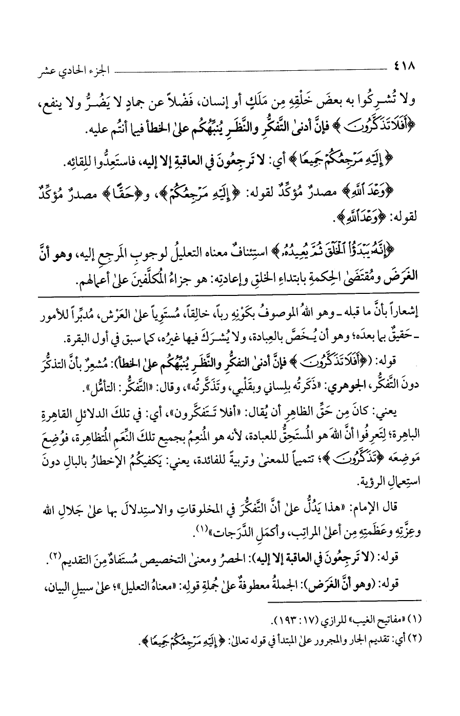 قال الإمام: "هذا يدل على أن التفكر في المخلوقات والاستدلال بها على جلال الله وعزته وعظمته من أعلى المراتب، وأكمل الدرجات".