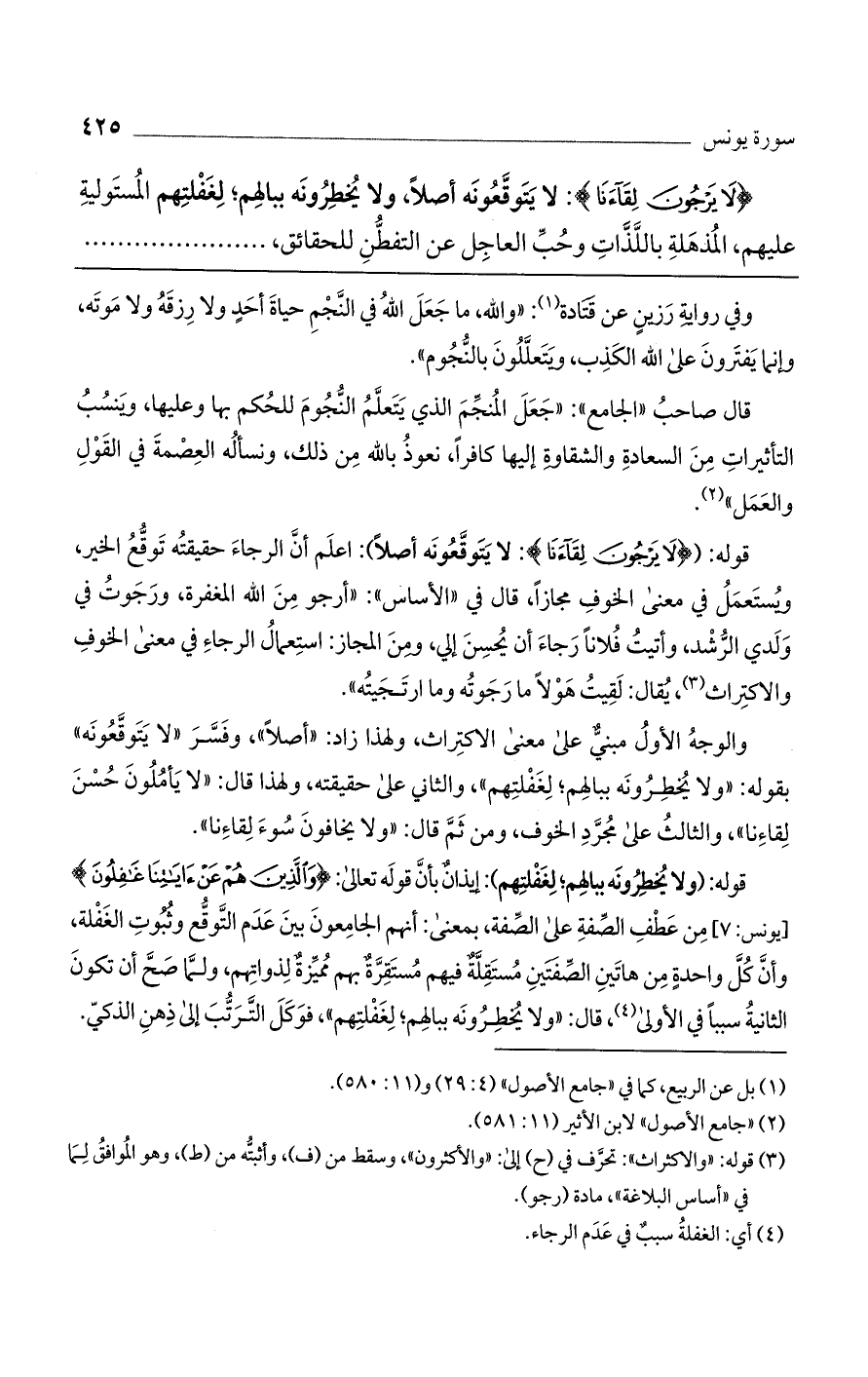 والوجه الأول مبني على معنى الاكتراث، ولهذا زاد: "أصلاً"، وفسر "لا يتوقعونه" بقوله"ولا يخطرونه ببالهم؛ لغفلتهم"، والثاني على حقيقته، ولهذا قال: "لا يأملون حُسن لقاءنا"، والثالث على مجرد الخوف، ومن ثم قال: "ولا يخافون سوء لقاءنا".