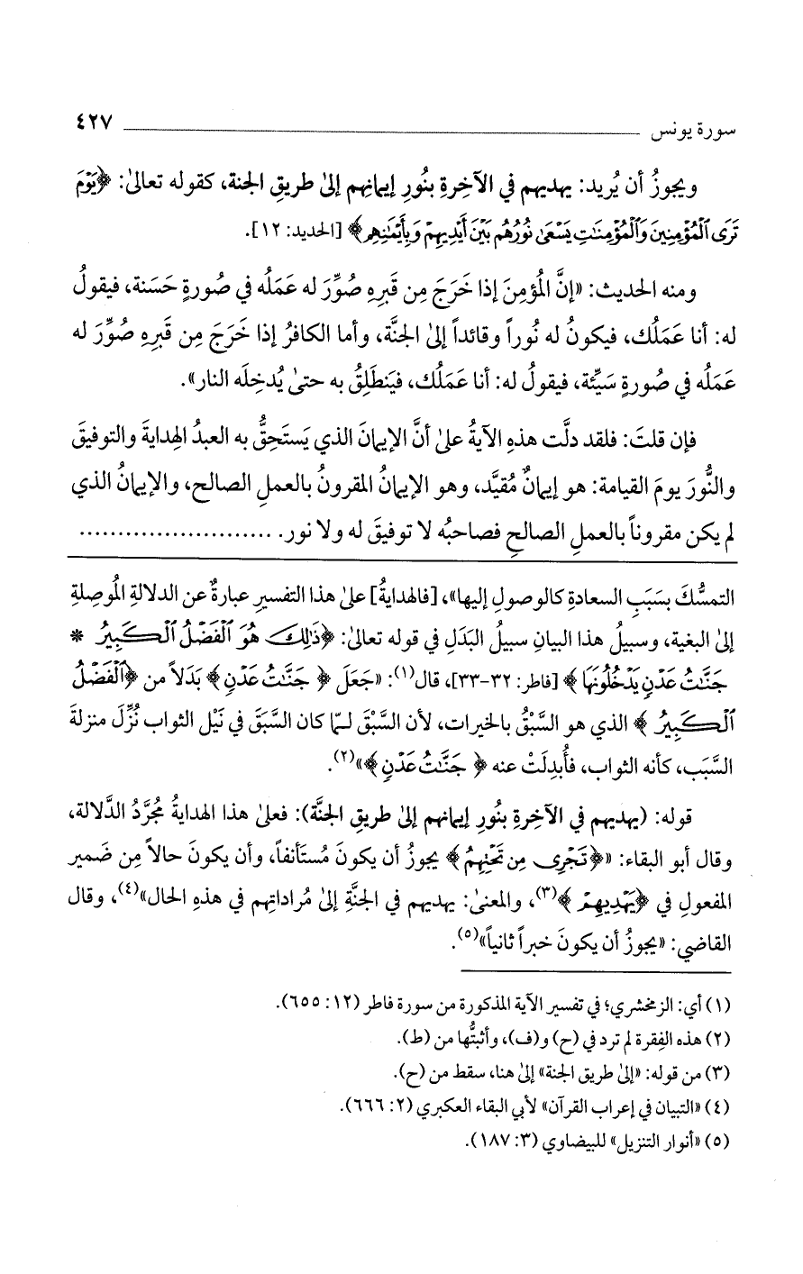 التمسك بسبب السعادة كالوصول إليها"، [فالهداية] على هذا التفسير عبارة عن الدلالة الموصلة إلى البغية، وسبيل هذا البيان سبيل البدل في قوله تعالى: (ذَلِكَ هُوَ الْفَضْلُ الْكَبِيرُ * جَنَّاتُ عَدْنٍ يَدْخُلُونَهَا) [فاطر: 32 - 33]، قال: "جعلَ (جَنَّاتُ عَدْنٍ) الذي هو السبق بالخيرات، لأن السبق لما كان السبق في نيل الثواب نُزل منزلة السبب، كأنه الثواب، فأبدلت عنه (جَنَّاتُ عَدْنٍ) ".