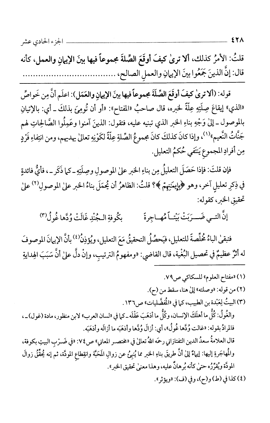 قوله: (ألا ترى كيف أوقع الصلة مجموعاً فيها بين الإيمان والعمل): اعلم أن من خواص "الذي" إيقاع صلته علة لخبره، قال صاحب "المفتاح": "أو أن تُومئ بذلك-أي: بالإتيان بالموصول- إلى وجه بناء الخبر الذي تبنيه عليه، فتقول: الذين آمنوا وعملوا الصالحات لهم جنات النعيم"، وإذا كان كذلك كان مجموع الصلة علة لكونه تعالى يهديهم، ومن انتفاء فرد من أفراد المجموع ينتفي حكم التعليل.