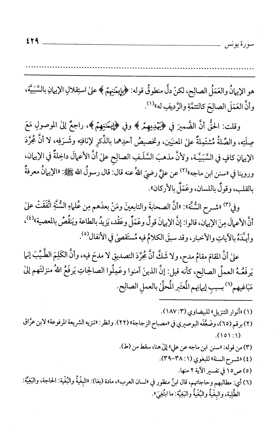 وفي "شرح السُّنة": "أن الصحابة التابعين ومن بعدهم من علماء السنة اتفقت على أن الأعمال من الإيمان، قالوا: إن الإيمان قول وعمل وعقد، يزيد بالطاعة وينقص بالمعصية"، وأيده بالآيات والأخبار، وقد سبق الكلام فيه مستقصى في الأنفال.