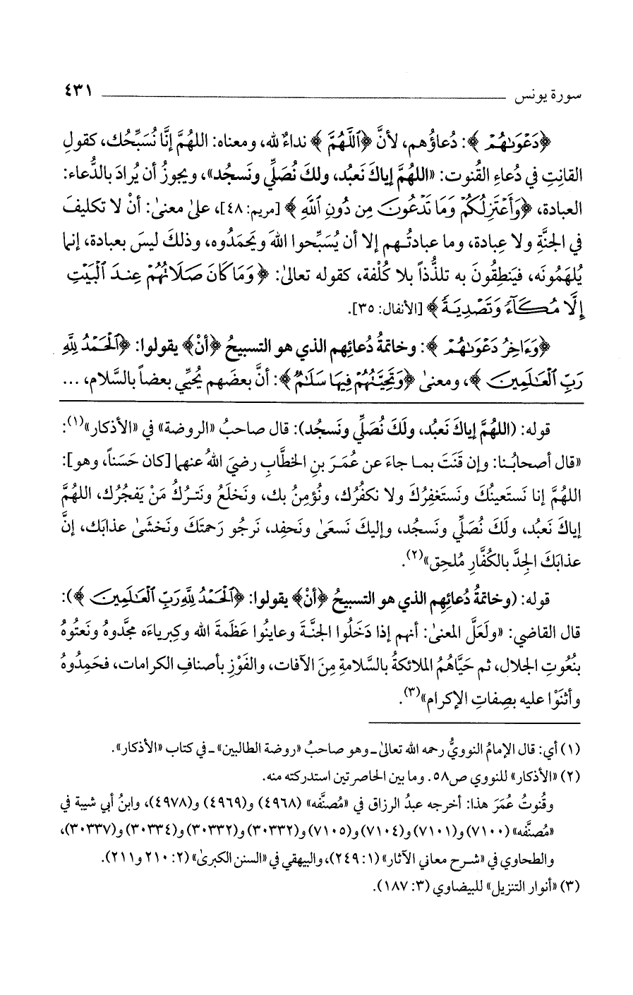 (دَعْواهُمْ): دعاؤهم، لأن (اللهمّ) نداء لله، ومعناه: اللهمّ إنا نسبحك، كقول القانت في دعاء القنوت: "اللهمّ إياك نعبد، ولك نصلى ونسجد"، ويجوز أن يراد بالدعاء: العبادة، (وَأَعْتَزِلُكُمْ وَما تَدْعُونَ مِنْ دُونِ اللَّهِ) [مريم: 48]، على معنى: أن لا تكليف في الجنة ولا عبادة، وما عبادتهم إلا أن يسبحوا الله ويحمدوه، وذلك ليس بعبادة، إنما يلهمونه، فينطقون به تلذذاً بلا كلفة، كقوله تعالى: (وَما كانَ صَلاتُهُمْ عِنْدَ الْبَيْتِ إِلَّا مُكاءً وَتَصْدِيَةً) [الأنفال: 35].