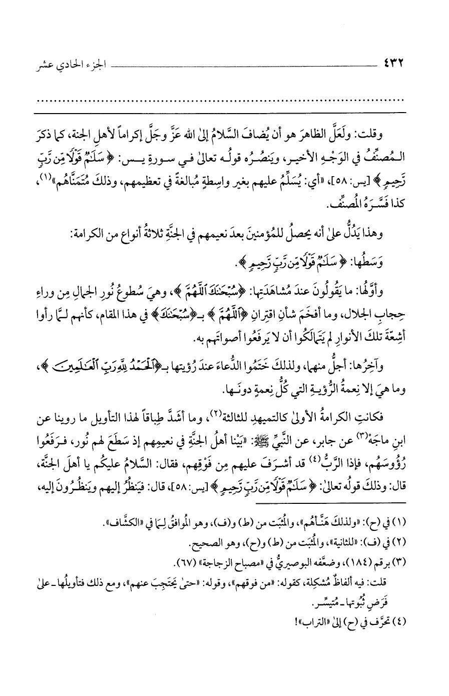 فكانت الكرامة الأولى كالتمهيد للثالثة، وما أشد طباقاً لهذا التأويل ما رويا عن ابن ماجه عن جابر، عن النبي صلى الله عليه وسلم: "بينا أهل الجنة في نعيمهم إذ سطع لهم نورن فرفعوا رؤوسهم، فإذا الرب قد أشرف عليهم من فوقهم، فقال: السلام عليكم يا أهل الجنة، قال: وذلك قوله تعالى: (سَلامٌ قَوْلاً مِنْ رَبٍّ رَحِيمٍ) [يس: 58]، قال: فينظر إليهم وينظرون إليه،