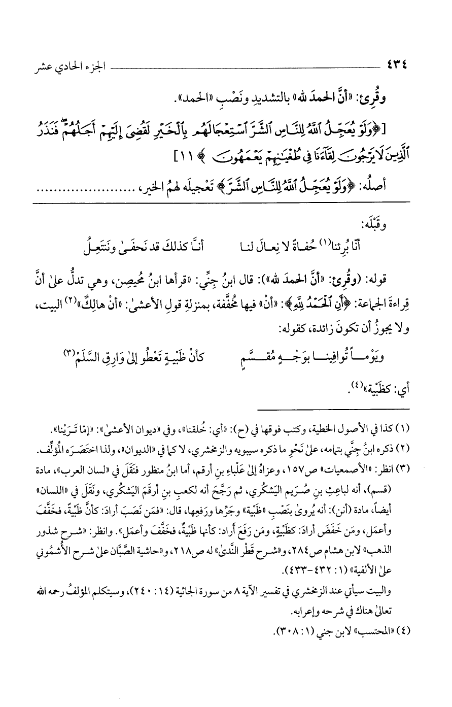 قوله: (وقرئ: "أن الحمد لله"): قال ابن جني: "قرأها ابن محيصن، وهي تدل على أن قراءة الجماعة: (أَنْ الْحَمْدُ لِلَّهِ): "أنْ" فيها مخففة، بمنزلة قول الأعشى: "أن هالكٌ" البيت، ولا يجوز أن تكون زائدة، كقوله: