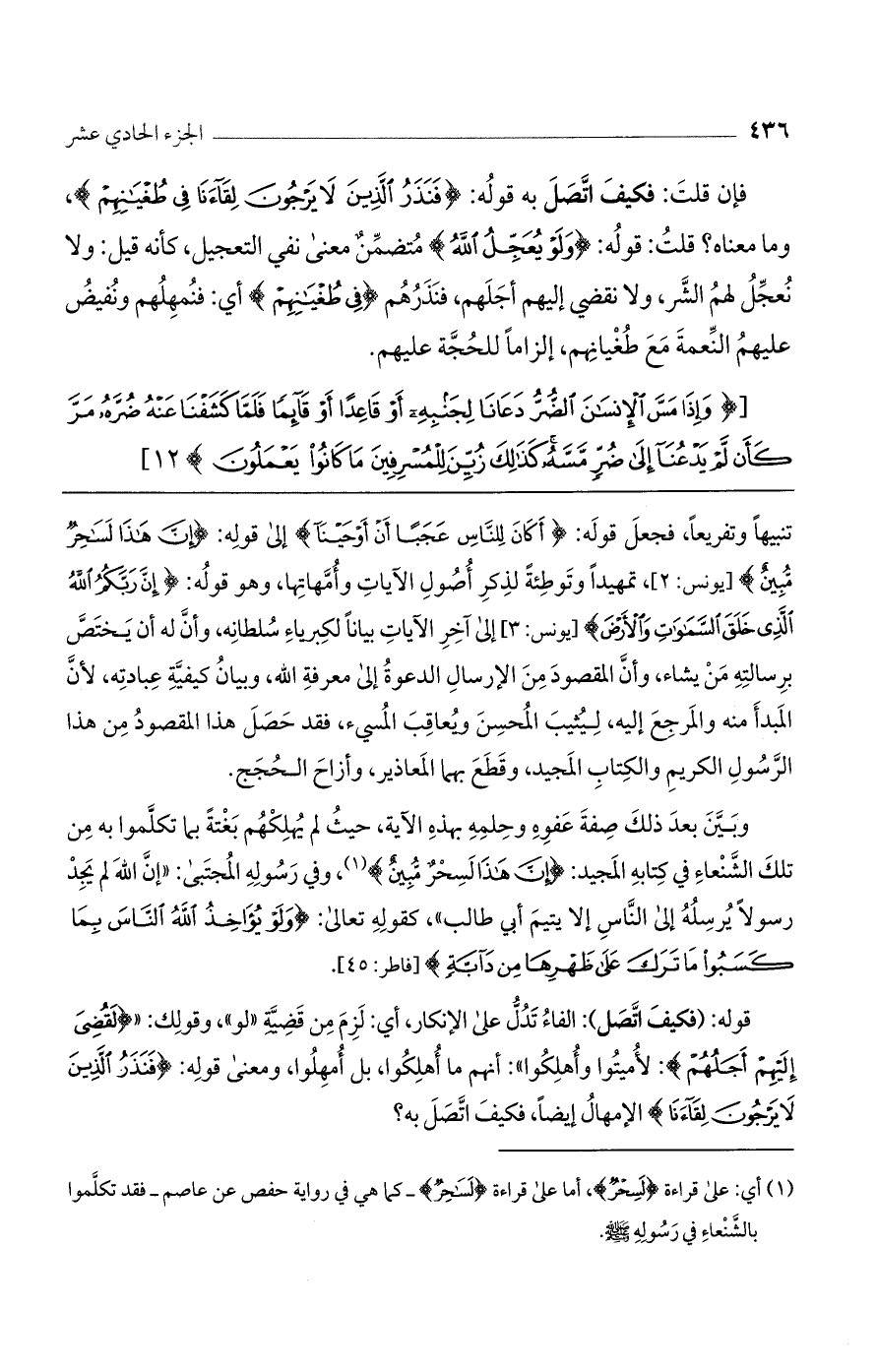 فإن قلت: فكيف اتصل به قوله: (فَنَذَرُ الَّذِينَ لا يَرْجُونَ لِقاءَنا فِي طُغْيانِهِمْ)، وما معناه؟ قلت: قوله (وَلَوْ يُعَجِّلُ اللَّهُ) متضمن معنى نفى التعجيل، كأنه قيل: ولا نعجل لهم الشر، ولا نقضي إليهم أجلهم، فنذرهم (فِي طُغْيانِهِمْ) أي: فنمهلهم ونفيض عليهم النعمة مع طغيانهم، إلزاما للحجة عليهم.