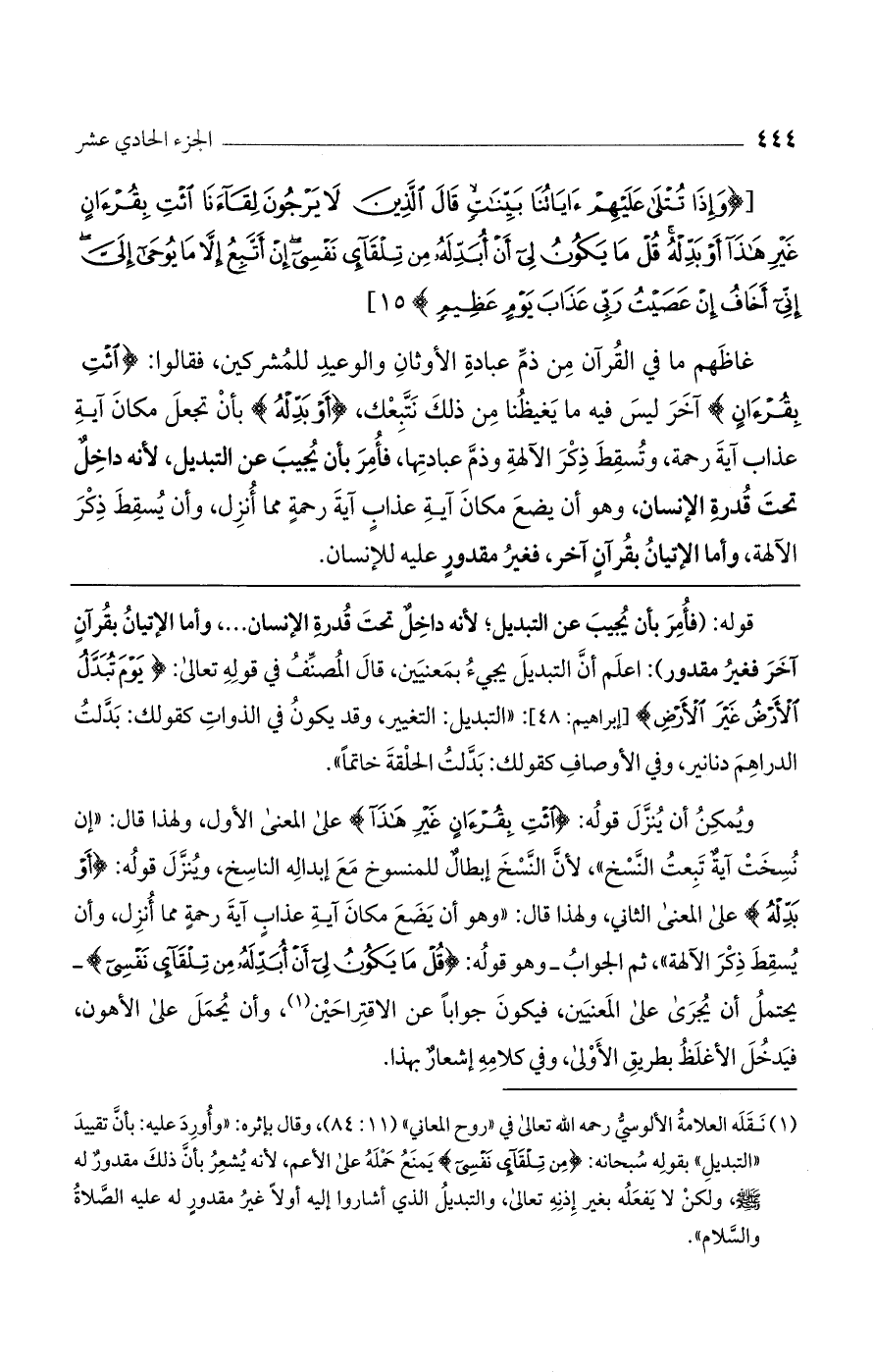 [(وَإِذا تُتْلى عَلَيْهِمْ آياتُنا بَيِّناتٍ قالَ الَّذِينَ لا يَرْجُونَ لِقاءَنَا ائْتِ بِقُرْآنٍ غَيْرِ هذا أَوْ بَدِّلْهُ قُلْ ما يَكُونُ لِي أَنْ أُبَدِّلَهُ مِنْ تِلْقاءِ نَفْسِي إِنْ أَتَّبِعُ إِلاَّ ما يُوحى إِلَيَّ إِنِّي أَخافُ إِنْ عَصَيْتُ رَبِّي عَذابَ يَوْمٍ عَظِيمٍ) 15].