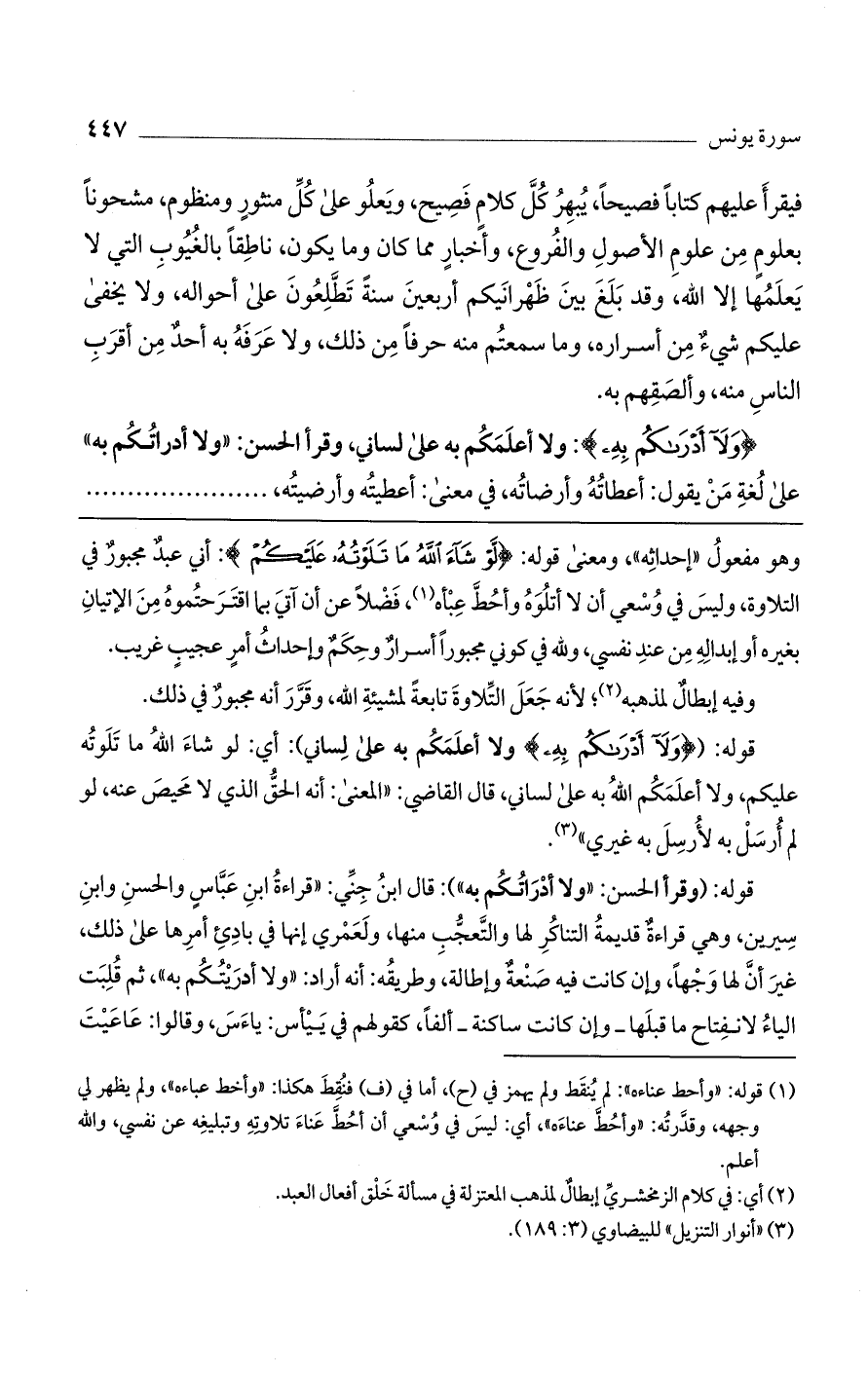 قوله: (وقرأ الحسن: "ولا أدراتكم به"): قال ابن جني: "قراءة ابن عباس والحسن وابن سيرين، وهي قراءة قديمة التناكر لها والتعجب منها، ولعمري إنها في بادئ أمرها على ذلك، غير أن لها وجهاً، وإن كانت فيه صنعة وإطالة، وطريقه: أنه أراد: "ولا أدريتكم به"، ثم قُلبت الياء لانفتاح ما قبلها- وإن كانت ساكنة - ألفاً، كقولهم في ييأس: ياءس، وقالوا: عاعيت
