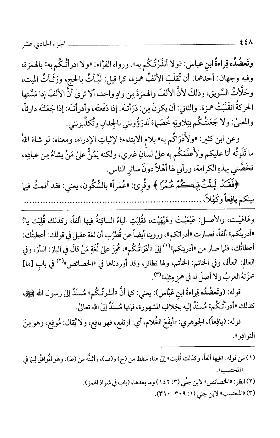 وتعضده قراءة ابن عباس: "ولا أنذرتكم به". ورواه الفراء: "ولا أدرأتكم به"، وبالهمزة، وفيه وجهان، أحدهما: أن تقلب الألف همزة، كما قيل: لبأت بالحج، ورثأت الميت وحلأت السويق، وذلك لأنّ الألف والهمزة من واد واحد، ألا ترى أنّ الألف إذا مستها الحركة انقلبت همزة. والثاني: أن يكون من: درأته إذا دفعته، وأدرأته إذا جعلته دارئا، والمعنى: ولا جعلتكم بتلاوته خصماء تدرؤونني بالجدال وتكذبونني.
