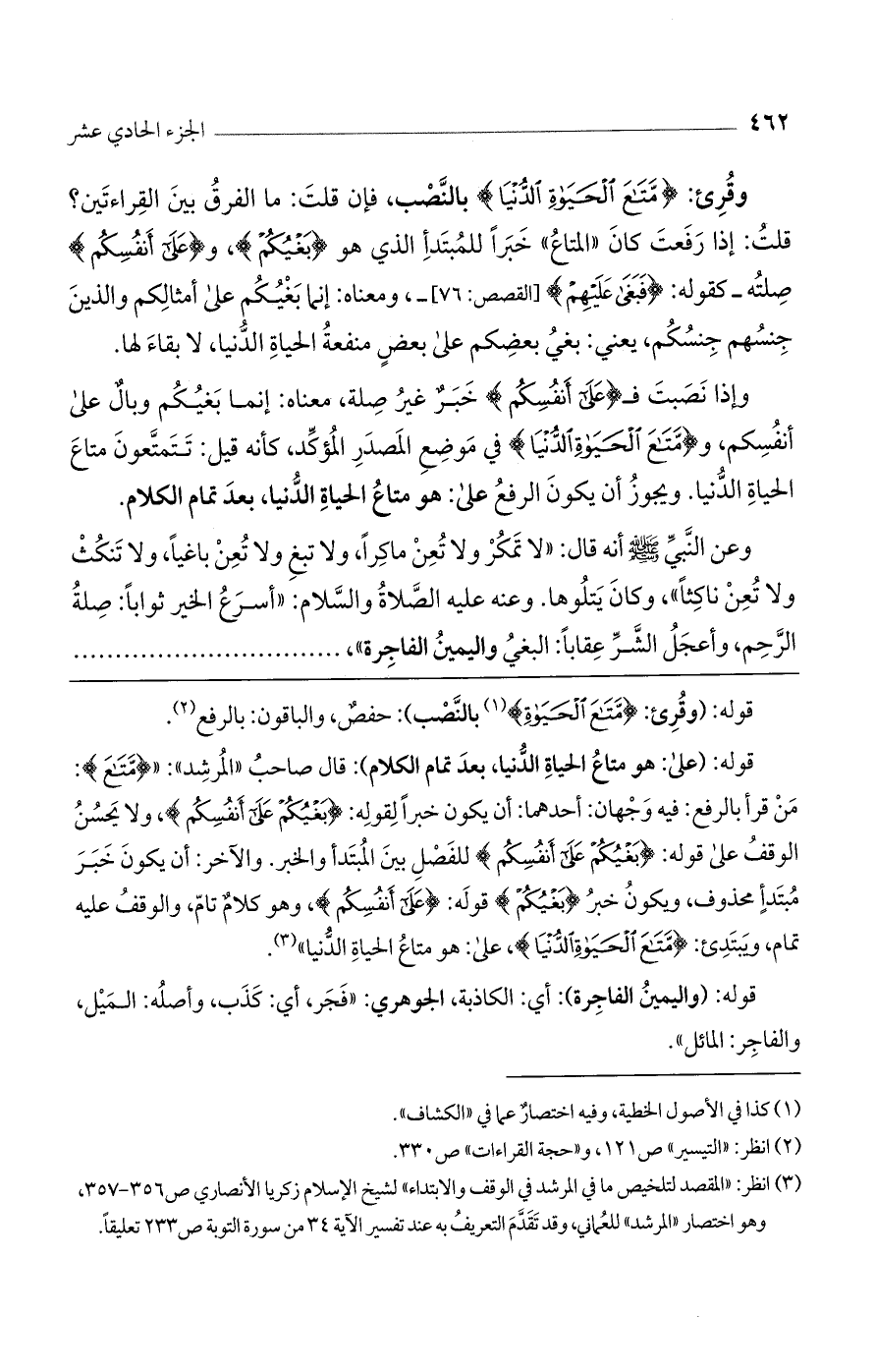 وإذا نصبت فـ (عَلى أَنْفُسِكُمْ) خبر غير صلة، معناه: إنما بغيكم وبال على أنفسكم، و (مَتاعَ الْحَياةِ الدُّنْيا) في موضع المصدر المؤكد، كأنه قيل: تتمتعون متاع الحياة الدنيا. ويجوز أن يكون الرفع على: هو متاع الحياة الدنيا، بعد تمام الكلام.
