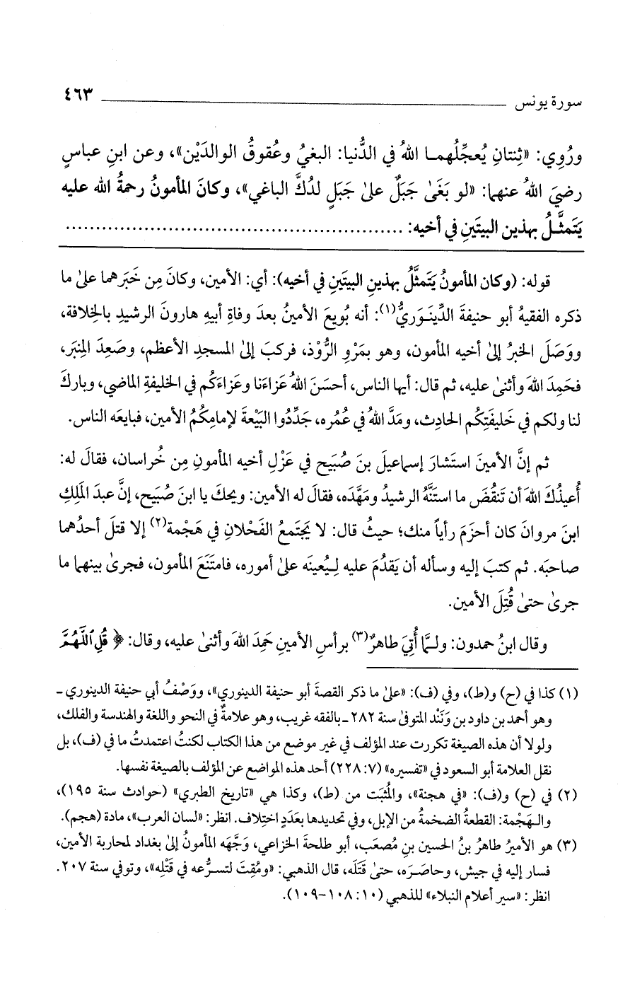 قوله: (وكان المأمون يتمثل بهذين البيتين في أخيه): أي: الأمين، وكان من خبرهما على ما ذكره الفقيه أبو حنيفة الدينوري: أنه بويع الأمين بعد وفاة أبيه هارون الرشيد بالخلافة، ووصل الخبر إلى أخيه المأمون، وهو بمرو الروذ، فركب إلى المسجد الأعظم، وصعد المنبر، فحمد الله وأثنى عليه، ثم قال: أيها الناس، أحسن الله عزاءنا وعزاءكم في الخليفة الماضين وبارك لنا ولكم في خليفتكم الحادث، ومد الله في عمره، جددوا البيعة لإمامكم الأمين، فبايعه الناس.