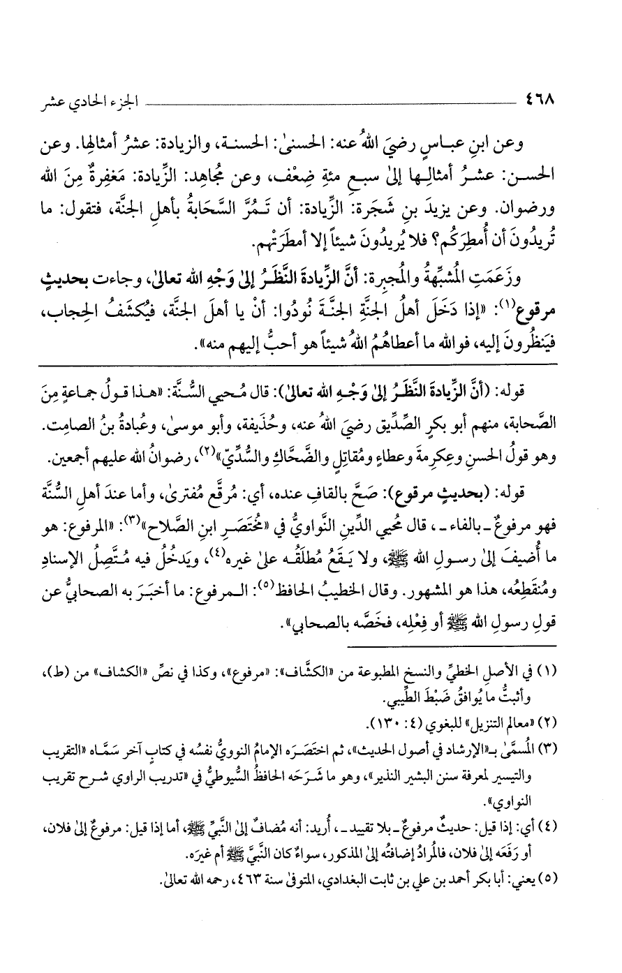 قوله: (أن الزيادة النظر إلى وجه الله تعالى): قال محيي السنة: "هذا قول جماعة من الصحابة، منهم أبو بكر الصديق رضي الله عنه، وحذيفة، وأبو موسى، وعبادة بن الصامت. وهو قول الحسن وعكرمة وعطاء ومقاتل والضحاك والسدى"، رضوان الله عليهم أجمعين.