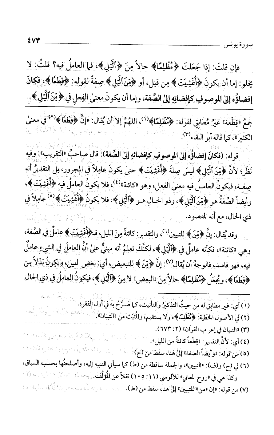 فإن قلت: إذا جعلت (مظلماً) حالا من (الليل)، فما العامل فيه؟ قلت: لا يخلو: إمّا أن يكون (أُغْشِيَتْ) من قبل، أو (مِنَ اللَّيْلِ) صفة لقوله: (قِطَعاً)، فكان إفضاؤه إلى الموصوف كإفضائه إلى الصفة، وإما أن يكون معنى الفعل في (مِنَ اللَّيْلِ).