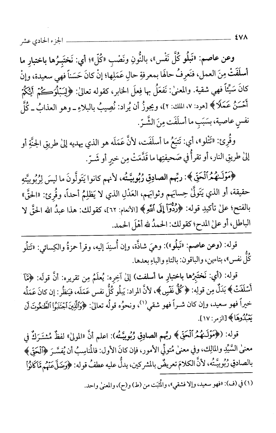 قوله: (وعن عاصم: "نبلو"): وهي شاذة، وإن أُسند إليه، وقرأ حمزة والكسائي: "تتلو كل نفس"، بتاءين، والباقون: بالتاء والباء بعدها.