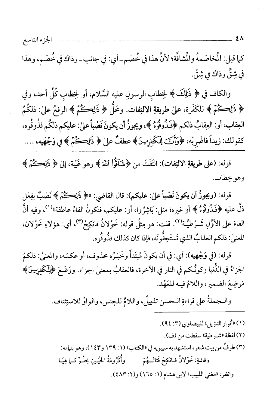 قوله: (ويجوز أن يكون نصباً على: عليكم): قال القاضي: " (ذَلِكُمْ) نصب بفعل دل عليه (فَذُوقُوهُ) أو غيره؛ مثل: باشروا، أو: عليكم، فتكون الفاء عاطفة"، وفيه أن الفاء على الأول شرطية. قلت: هو مثل قوله: خولان فانكح، أي: هؤلاء خولان، المعنى: ذلكم العذاب الذي تستحقونه، فإذا كان كذلك فذوقوه.