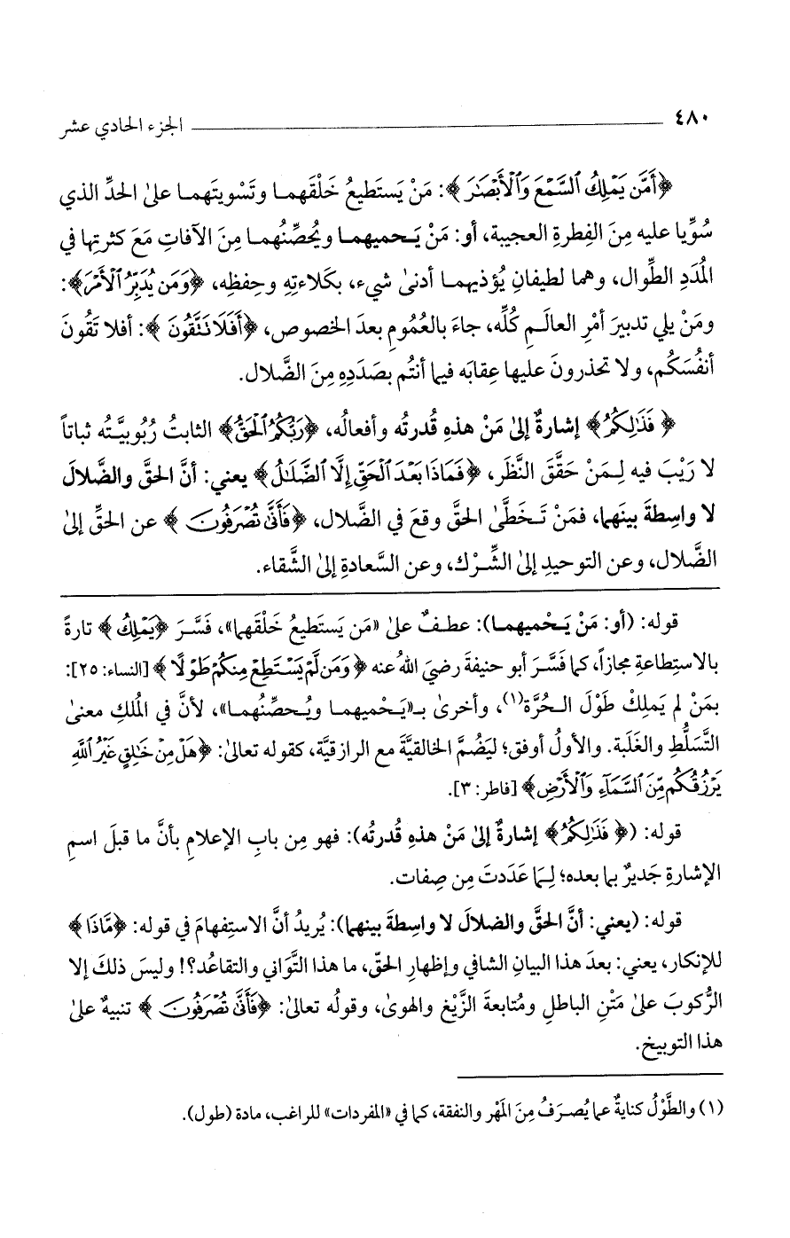 (أَمَّنْ يَمْلِكُ السَّمْعَ وَالْأَبْصارَ): من يستطيع خلقهما وتسويتهما على الحدّ الذي سويا عليه من الفطرة العجيبة. أو: من يحميهما ويحصنهما من الآفات مع كثرتها في المدد الطوال، وهما لطيفان يؤذيهما أدنى شيء بكلاءته وحفظه، (وَمَنْ يُدَبِّرُ الْأَمْرَ): ومن يلي تدبير أمر العالم كله، جاء بالعموم بعد الخصوص، (أَفَلا تَتَّقُونَ): أفلا تقون أنفسكم ولا تحذرون عليها عقابه فيما أنتم بصدده من الضلال.
