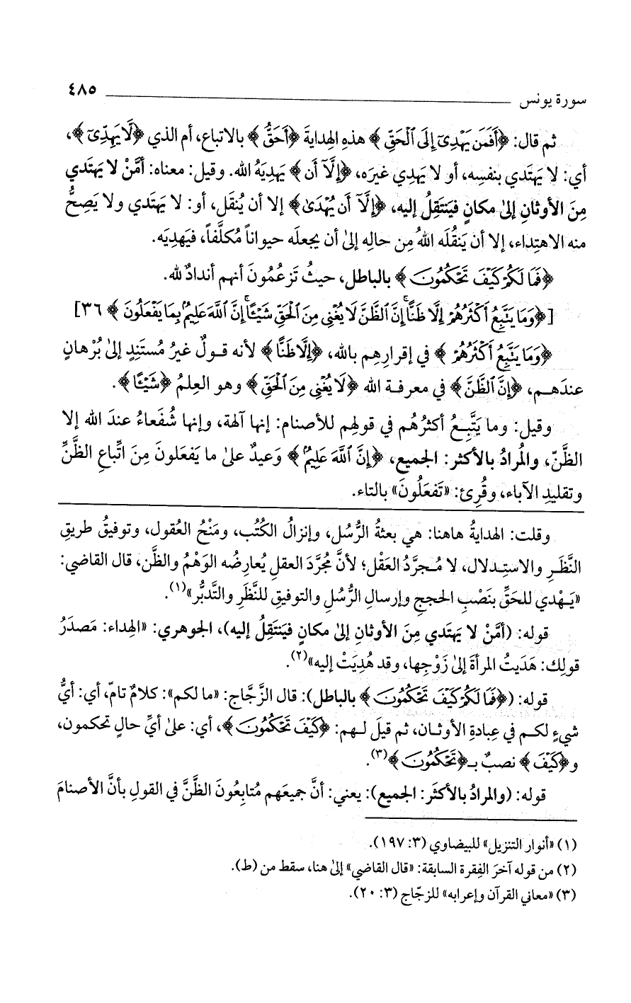 ثم قال: (أفمن يهدى إلى الحق) هذه الهداية (أحق) بالإتباع، أم الذي (لا يهدى) أي: لا يهتدي بنفسه، أو لا يهدى غيره، (إلا أن) يهديه الله. وقيل: معناه أمن لا يهتدي من الأوثان إلى مكان فينتقل إليه، (إِلَّا أَنْ يُهْدى) إلا أن ينقل، أو لا يهتدي ولا يصح منه الاهتداء إلا أن ينقله الله من حاله إلى أن يجعله حيواناً مكلفاً، فيهديه.
