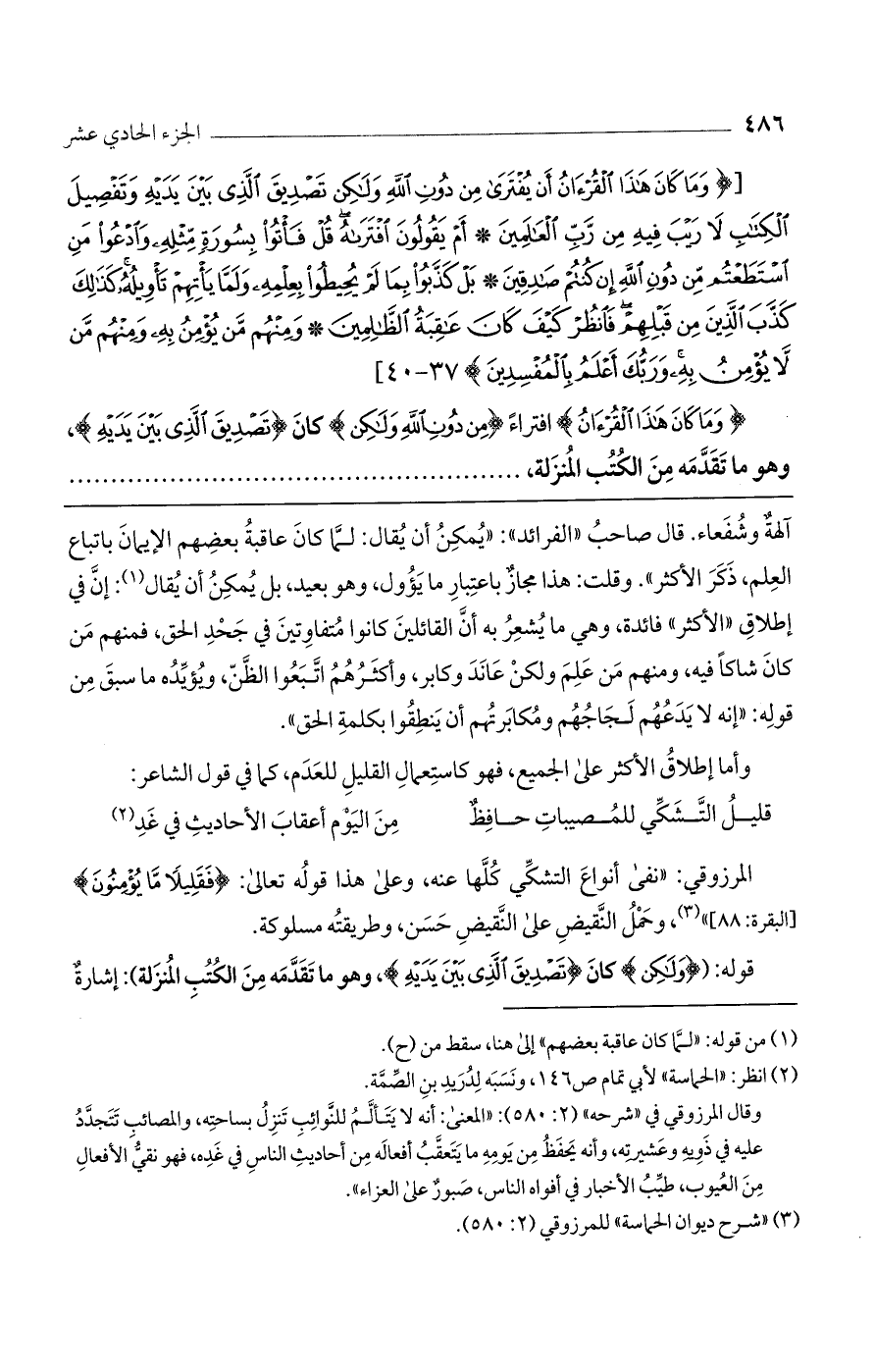 (وَما كانَ هذَا الْقُرْآنُ) افتراء (مِنْ دُونِ اللَّهِ وَلكِنْ) كان (تَصْدِيقَ الَّذِي بَيْنَ يَدَيْهِ)، وهو ما تقدمه من الكتب المنزلة،