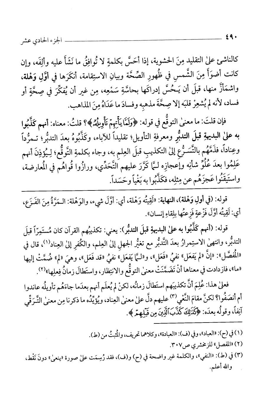 فإن قلت: ما معنى التوقع في قوله: (وَلَمَّا يَاتِهِمْ تَاوِيلُهُ)؟ قلت: معناه: أنهم كذبوا به على البديهة قبل التدبر ومعرفة التأويل؛ تقليداً للآباء، وكذبوه بعد التدبر، تمرداً وعناداً، فذمّهم بالتسرع إلى التكذيب قبل العلم به، وجاء بكلمة التوقع؛ ليؤذن أنهم علموا بعد علو شأنه وإعجازه لما كرّر عليهم التحدّي، ورازوا قواهم في المعارضة، واستيقنوا عجزهم عن مثله، فكذبوا به بغياً وحسداً.