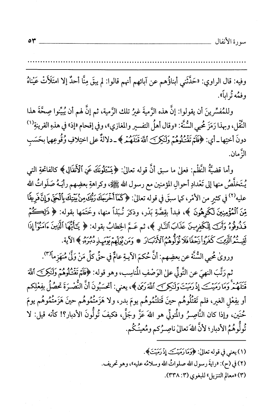 وللمفسرين أن يقولوا: إن هذه الرمية غير تلك الرمية، ثم إن لهم أن يبينوا صحة هذا النقل، وبهذا رمز محيي السنة: "وقال أهل التفسير والمغازي"، وفي إقحام "إذ" في هذه القرينة دون أختها - أي: (فَلَمْ تَقْتُلُوهُمْ وَلَكِنَّ اللَّهَ قَتَلَهُمْ) - دلالة على اختلاف وقوعهما بحسب الزمان.