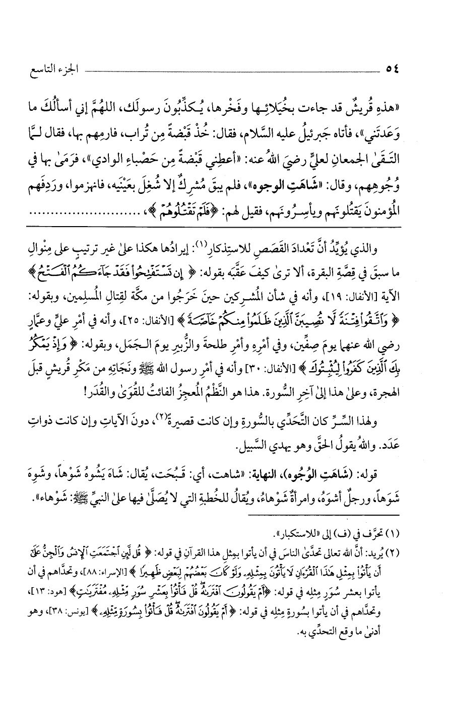 والذي يؤيد أن تعداد القصص للاستذكار: إيرادها هكذا على غير ترتيب على منوال ما سبق في قصة البقرة، ألا ترى كيف عقبه بقوله: (إِنْ تَسْتَفْتِحُوا فَقَدْ جَاءَكُمْ الْفَتْحُ) الآية [الأنفال: 19]، وأنه في شأن المشركين حين خرجوا من مكة لقتال المسلمين، وبقوله: (وَاتَّقُوا فِتْنَةً لا تُصِيبَنَّ الَّذِينَ ظَلَمُوا مِنْكُمْ خَاصَّةً) [الأنفال: 25]، وأنه في أمر علي وعمار رضي الله عنهما يوم صفين، وفي أمره وأمر طلحة والزبير يوم الجمل، وبقوله: (وَإِذْ يَمْكُرُ بِكَ الَّذِينَ كَفَرُوا لِيُثْبِتُوكَ) [الأنفال: 30] وأنه في أمر رسول الله صلى الله عليه وسلم ونجاته من مكر قريش قبل الهجرة، وعلى هذا إلى آخر السورة. هذا هو النظم المعجز الفائت للقوى والقدر!