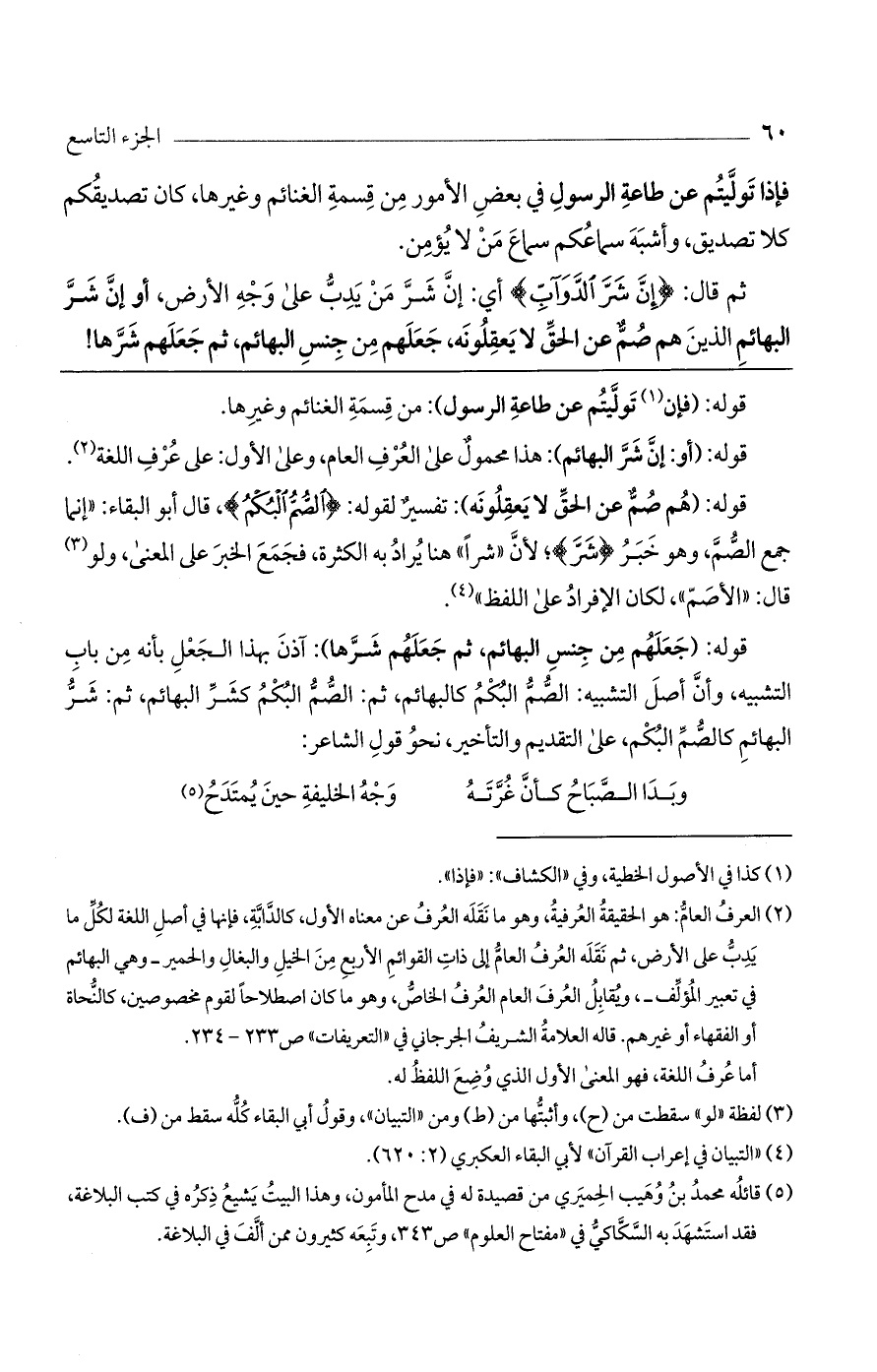قوله: (هم صم عن الحق لا يعقلونه): تفسير لقوله: (الصُّمُّ الْبُكْمُ)، قال أبو البقاء: "إنما جمع الصم، وهو خبر (شَرَّ)؛ لأن "شراً" هنا يُراد به الكثرة، فجمع الخبر على المعنى، ولو قال: "الأصم"، لكان الإفراد على اللفظ".